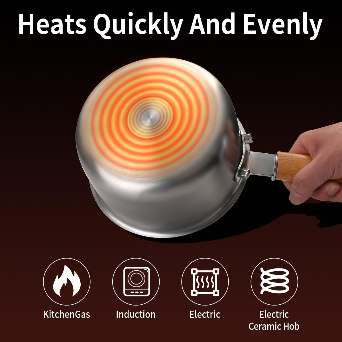• Iduction Base: The sauce pot with induction base, even heat distribution, compatible with all cooktops including gas, ceramic, and induction, offering flexibility for every kitchen.