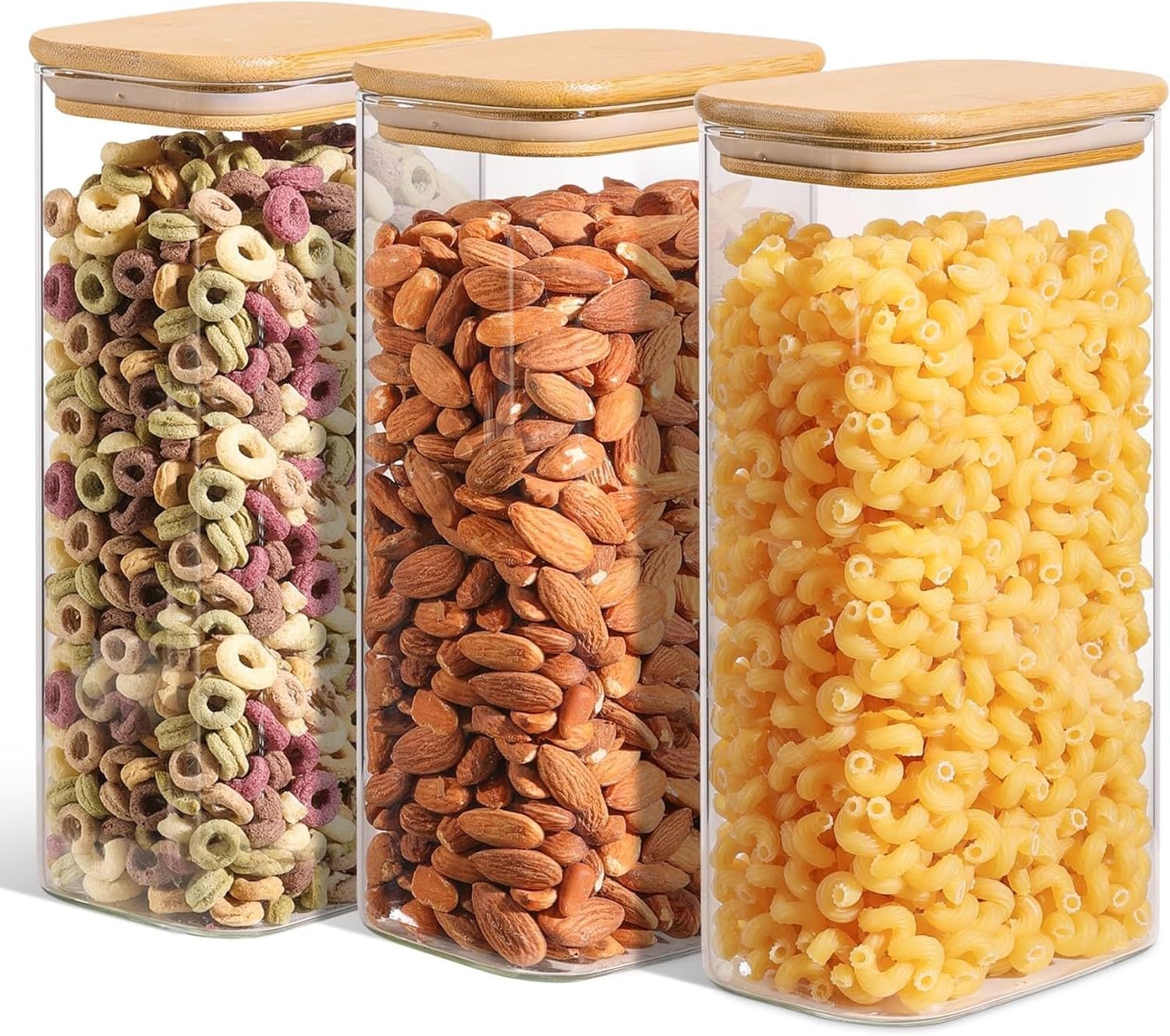 54oz 3PCS Rectangle Glass Storage Containers with Lids, Glass Jars with Bamboo Lids, Clear Food Storage Jar, Sugar Coffee Containers, Pantry Container for Pasta, Rice, Flour, Oats, Tea