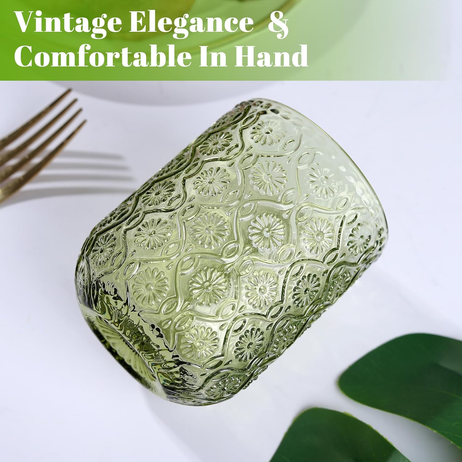 Joeyan Small Green Drinking Glasses,Vintage Embossed Floral Water Glass Tumbler Cups,Colored Beverages Cocktail Juice Wine Glassware,9 oz,Set of 4,Dishwasher Safe