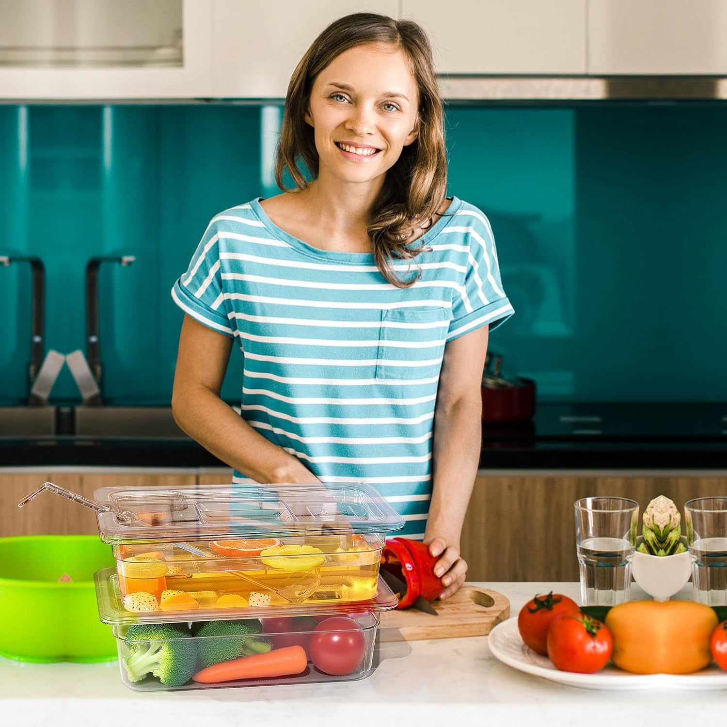 • Two Style 1/3 Size Pan Lids: The 1/3 size clear food pan comes with a compatible 1/3 size pot lid. Includes 1 open lid and 5 non-opening lids. The 1/3 pan attachment provides a secure seal, maintaining the freshness and quality of stored food. Effectively avoid odor transfer between products. The lid has a notched handle for easy operation and removal