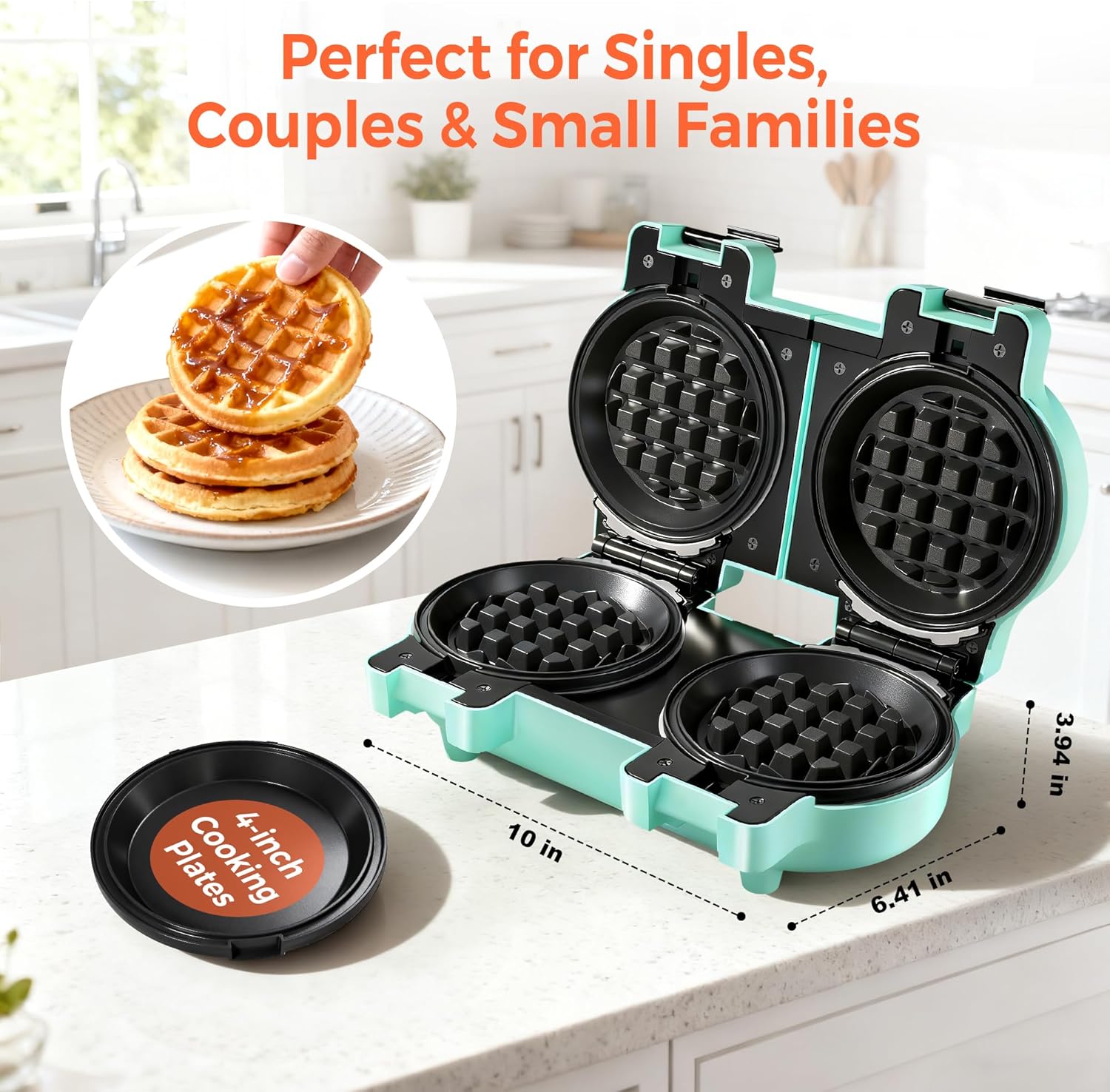 2-in-1 Double Waffle & Pancake Maker - CACHOO Mini 4" Nonstick Waffle Iron & Small Round Griddle with 4 Removable Plate Sets, Dishwasher Safe, Perfect for Small Spaces, Apartments & Dorms, Aqua