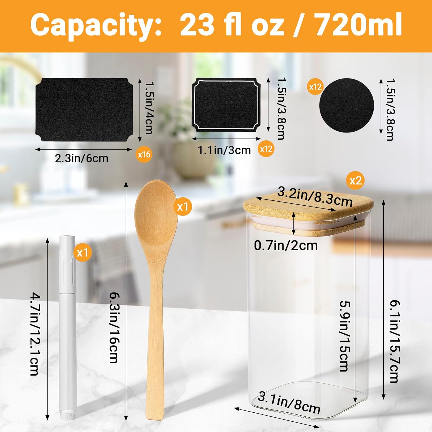 • 2 Pack Square Pantry Jars - Set includes 2 pcs glass jars with bamboo lids (23 fl.oz / 720ml each, size 3.1 x 5.9 inch). Comes with 1 bamboo spoon, 40 blank labels stickers, and 1 chalk marker, which is great pantry organization containers for kitchen countertop. Please check the size chart carefully before purchasing these jars to ensure it meets your needs.