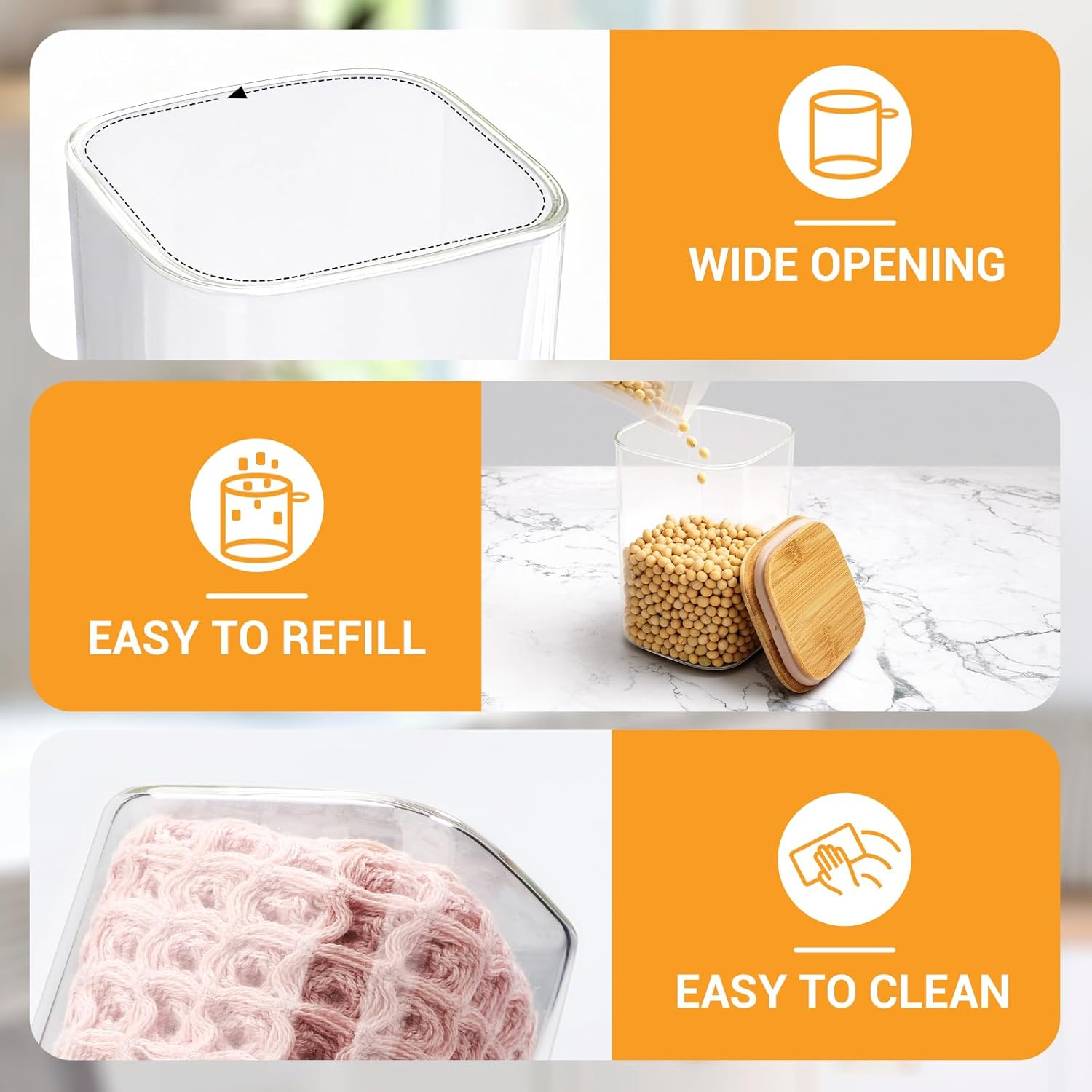 • Wide Mouth Canister for Easy Use - Wide-mouth glass storage containers are convenient to fill, scoop, and easy to clean. Use the included bamboo spoon to easily scoop flour, sugar, spices, beans, snacks, or ground coffee – versatile pantry jars for daily organization.