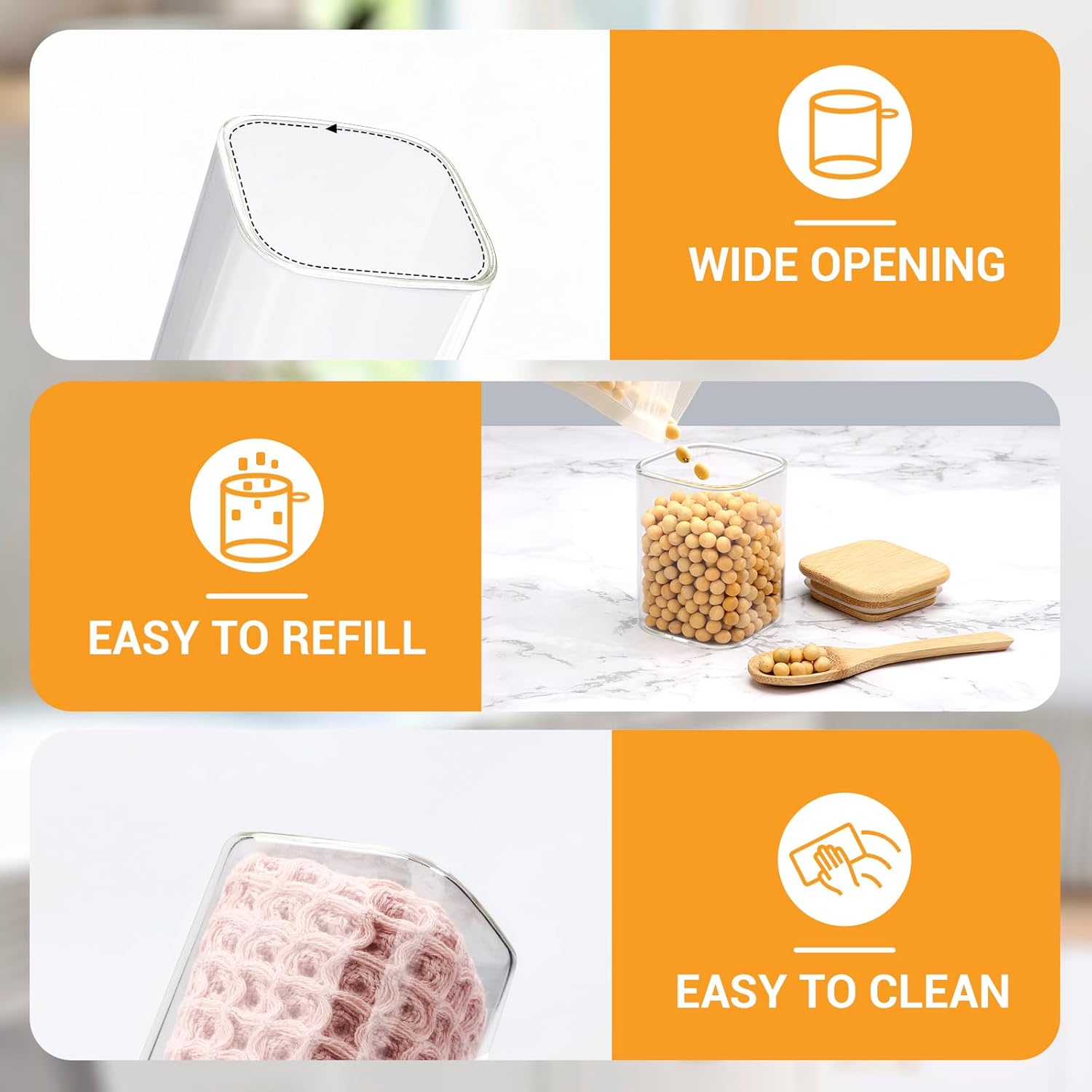 • Wide Mouth Canister for Easy Use - Wide-mouth glass storage containers are convenient to fill, scoop, and easy to clean. Use the included bamboo spoon to easily scoop flour, sugar, spices, beans, snacks, or ground coffee – versatile pantry jars for daily organization.