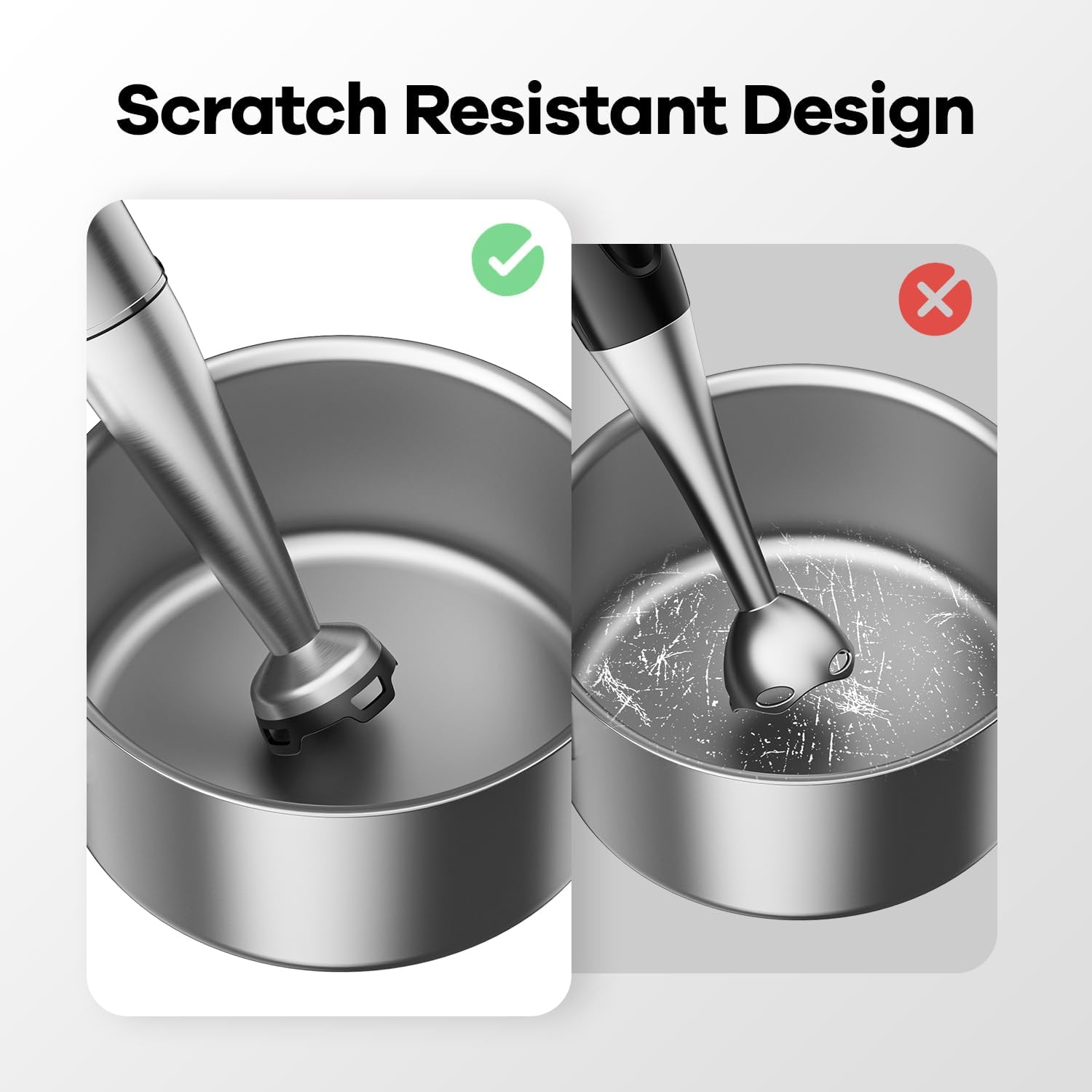 • Protect Your Cookware: This immersion blender handheld has a bell shaped base and food-grade nylon blade guard to protect your pots and pans from scratches and extend the life of kitchen tools. It also can prevents splatter to keep your clothes and kitchen clean