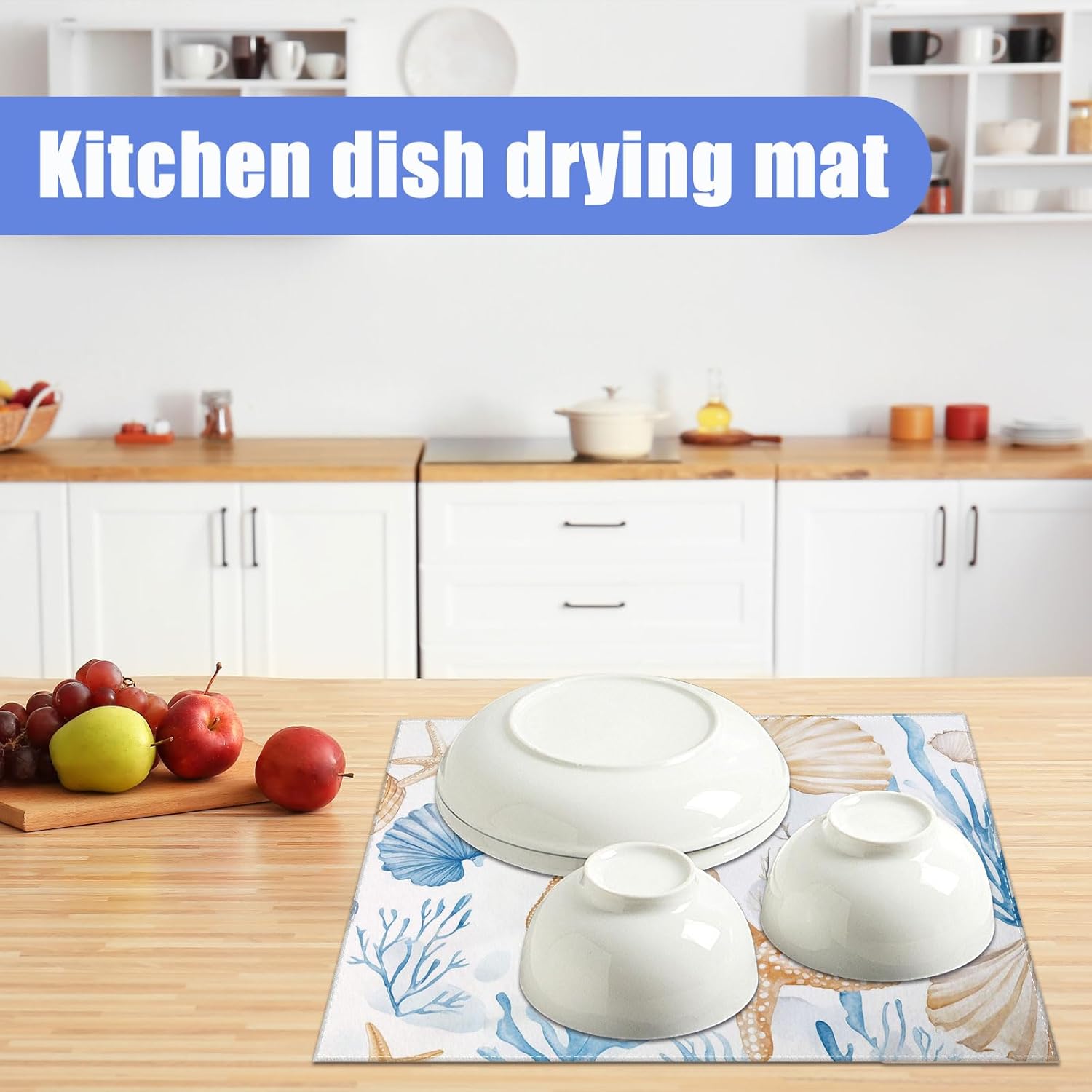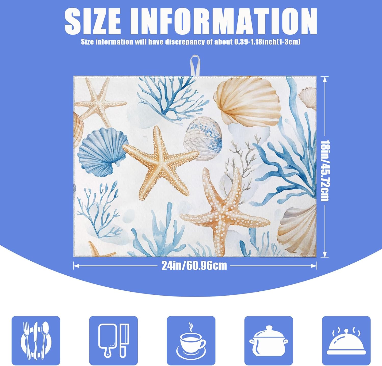 Beach Seashell Starfish Dish Drying Mat for Kitchen Counter Nautical Coastal Drying Pad Absorbent Reversible Dish Drainer Rack Mats Draining Pad