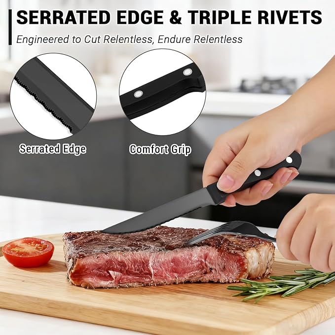 • 【PRACTICAL STEAK KNIFE】We’ve also included 12 extra premium steak knives to complement our stainless steel black silverware set—each features a precision-forged serrated edge for effortless cutting. These steak knives boast a triple-rivet handle design that boosts structural stability, prevents loosening, offers perfect balance, and delivers a non-slip grip for precise control.