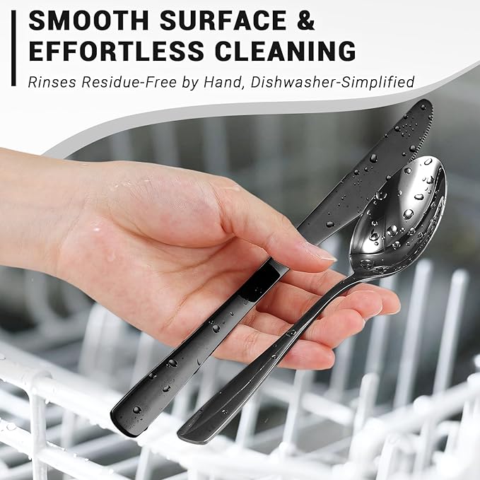 • 【EASY TO CLEAN】This stainless steel black silverware set has a smooth surface that helps keep food from sticking. Better yet, this kitchen utensils set seamless design allows water and detergent—and it’s fully dishwasher safe, so post-meal care is a breeze to keep your cutlery looking pristine.For even better care, we recommend wiping it clean with a soft cloth; plus, drying it quickly right after washing will help maintain its shiny luster.