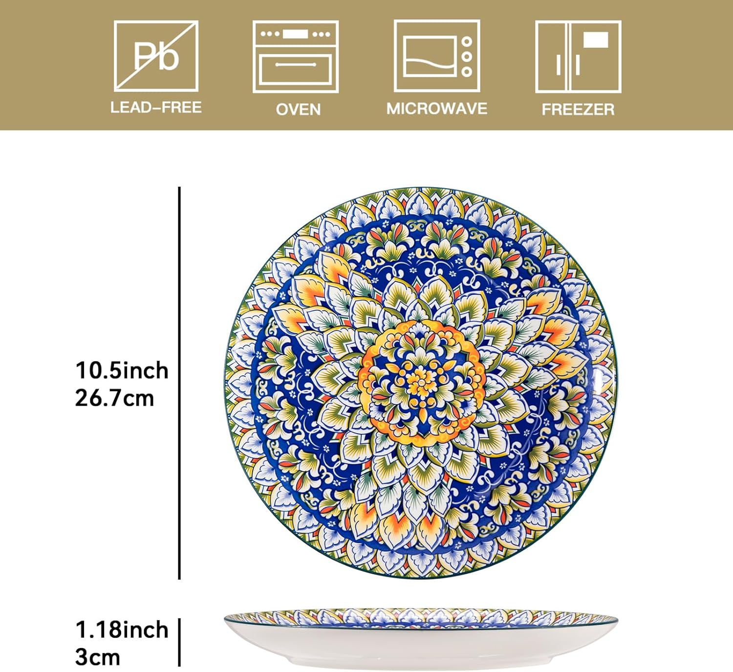 Sweejar Dinner Plates 10.5 Inch,Ceramic Large Plates Set of 6,Bohemian Style Colorful Plate Dishwasher and Microwave Safe Round Porcelain Dessert Plates for Kitchen