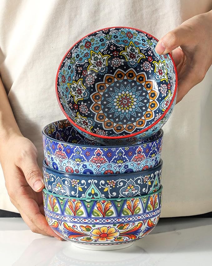 • Versatile Bohemian Home Decor: Beyond the dining table, these stunning ceramic plates and bowls serve as gorgeous boho decor. Showcase their vibrant colors and intricate patterns on open kitchen shelves, wall displays, or rustic kitchen racks. This versatile set effortlessly enhances any boho-chic, rustic farmhouse, or eclectic interior styling, making it a stylish and free-spirited decorative accent for your home.