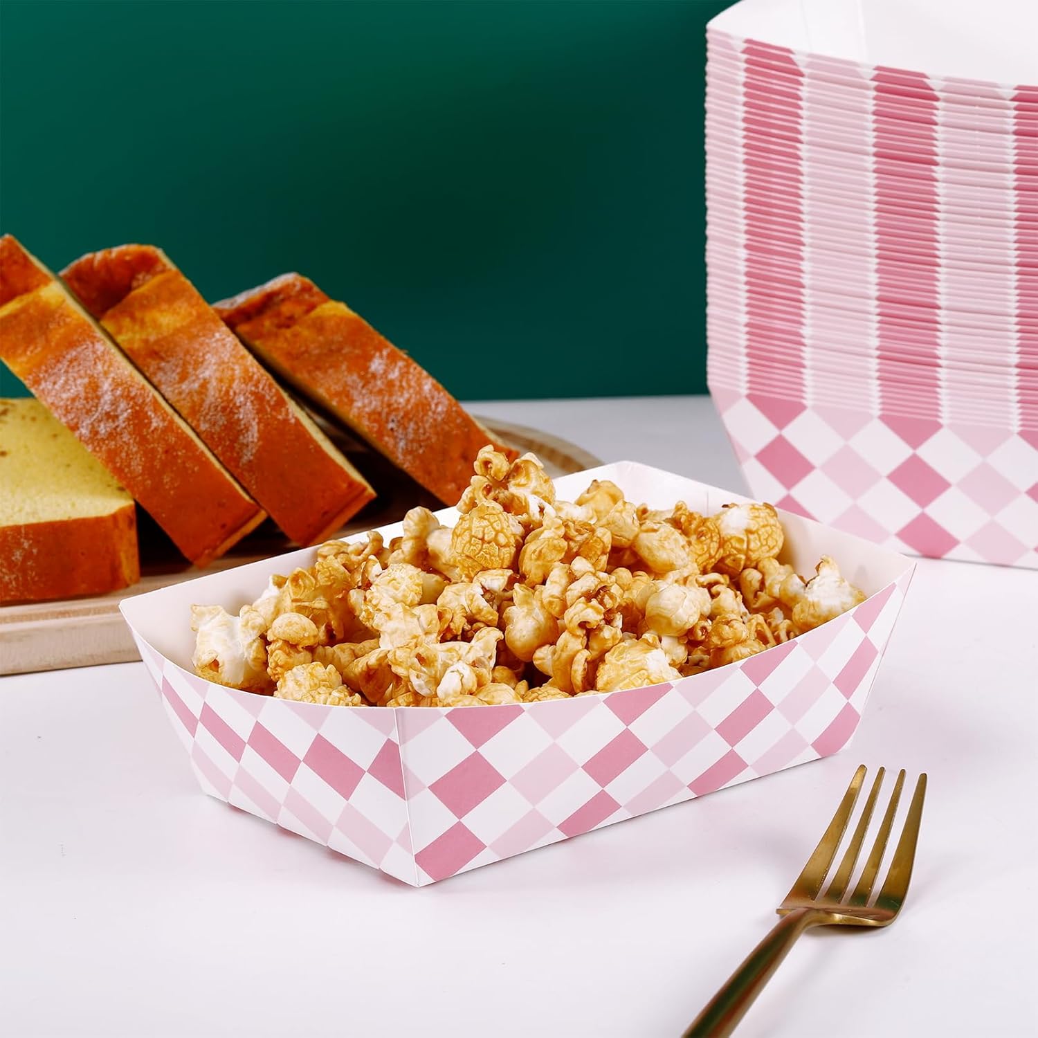 • 100 Food Boats: This package includes 100 pink and white plaid disposable paper boat containers. These are a generous quantity and beautifully designed for everyday use
