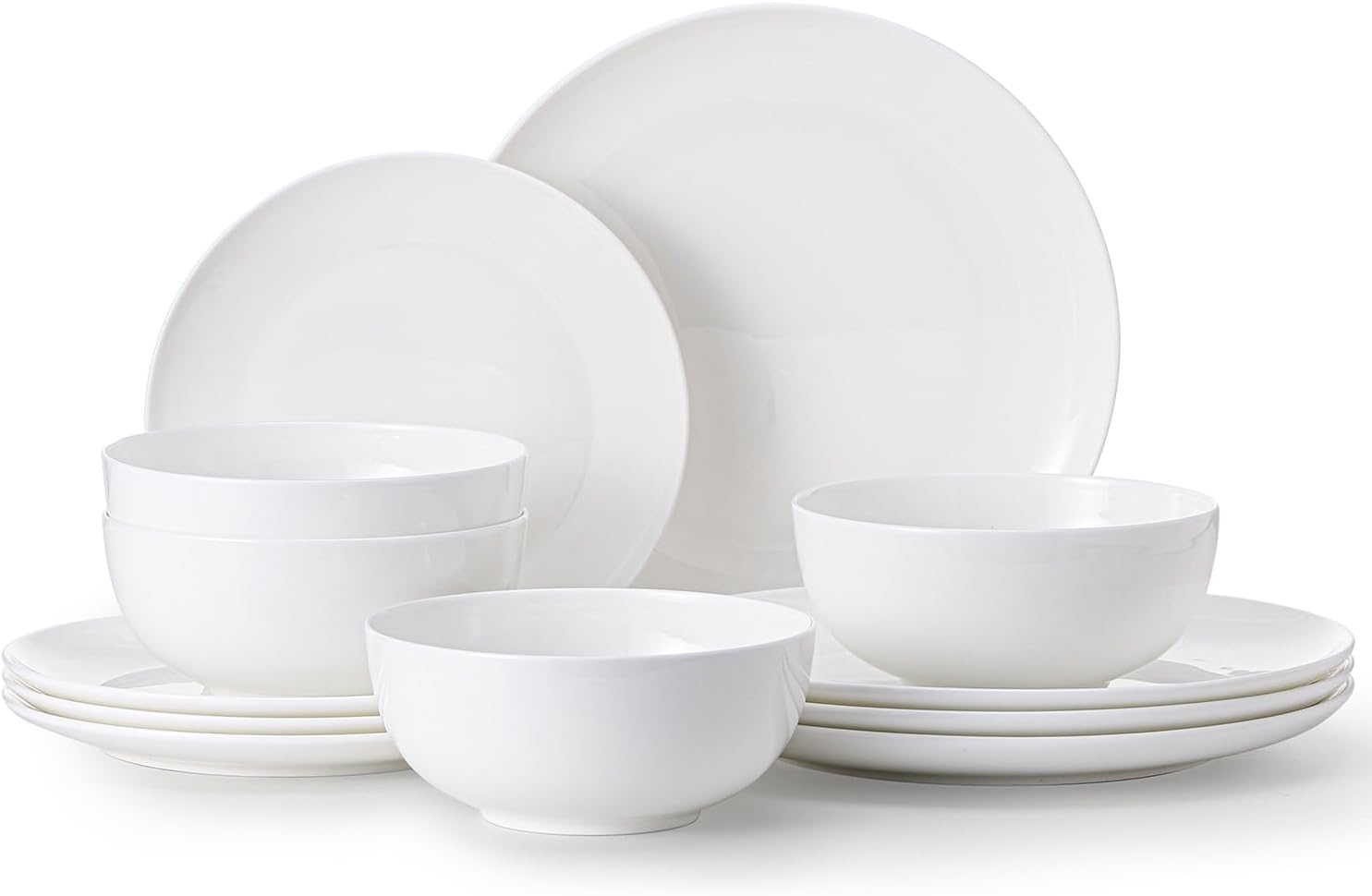 KINGSTONE Bone China Dinnerware Sets, 12-Piece Dinnerware Set for 4, Lightweight Durable, Dishwasher Safe, Tableware for Daily Use with Elegant Design, White