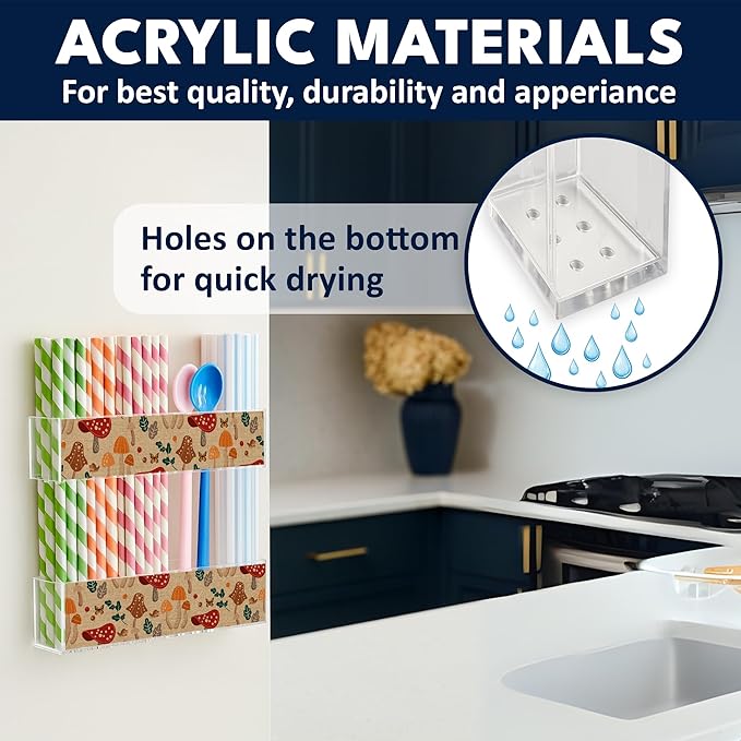 Acrylic Straw Holder for Cabinet Door or Countertop - Clear Organizer & Dispenser with 3 Sets of Decorative Stickers for Reusable Straws, Space-Saving Kitchen Storage, Pantry Organizer