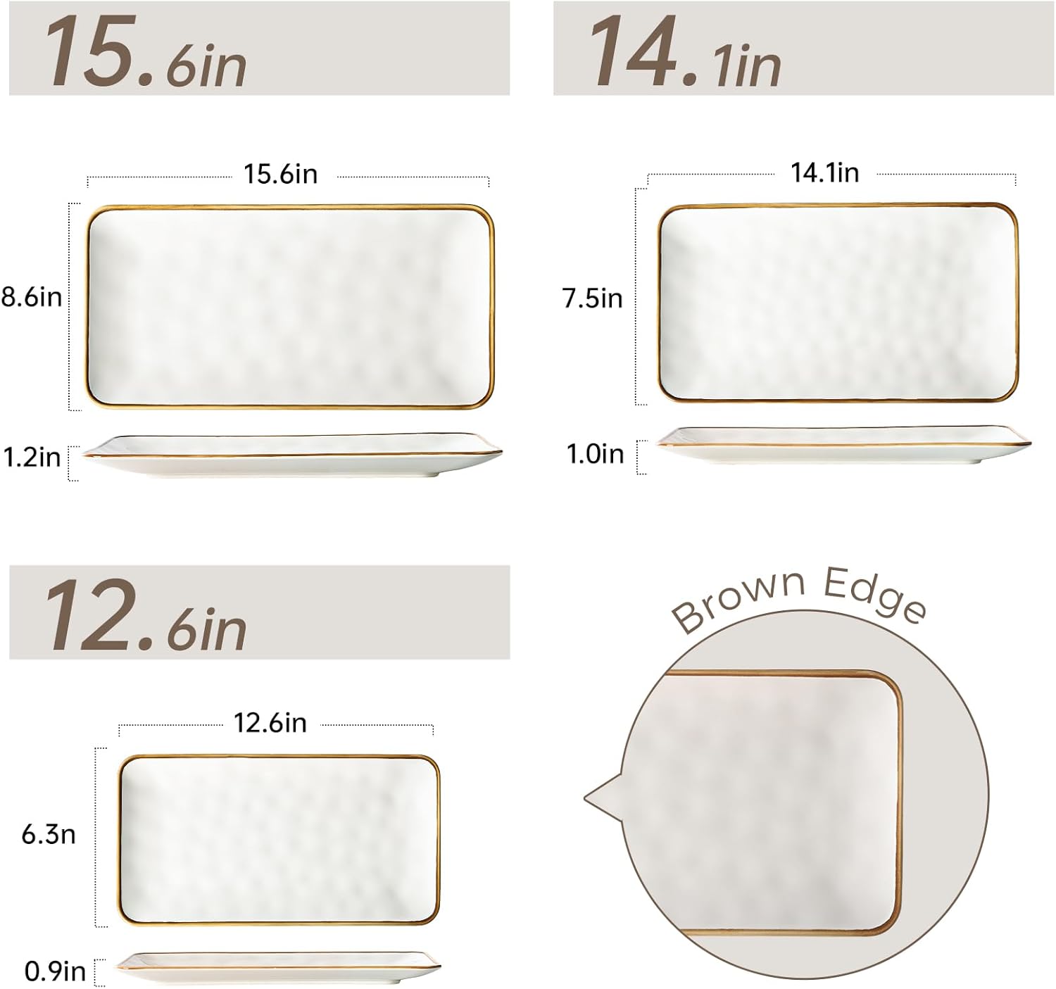 Ceramic Rectangle Serving Platter with Brown Rim: 15.6/14.1/12.6 Inch Large Serving Dishes for Entertaining Party, Turkey, Cheese, Sushi, Snack and Dessert, Microwave Dishwasher Safe