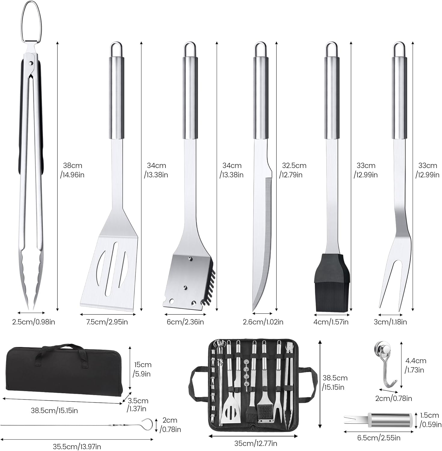 • Included Components : 5pcs skewers, fork, spatula, food tongs, knife, basting brush, grill cleaning brushes, 4pcs corn holders, 6pcs magnetic hook 5pcs skewers, fork, spatula, food tongs, knife, basting brush, grill cleaning brushes, 4pcs corn holders, 6pcs magnetic hook