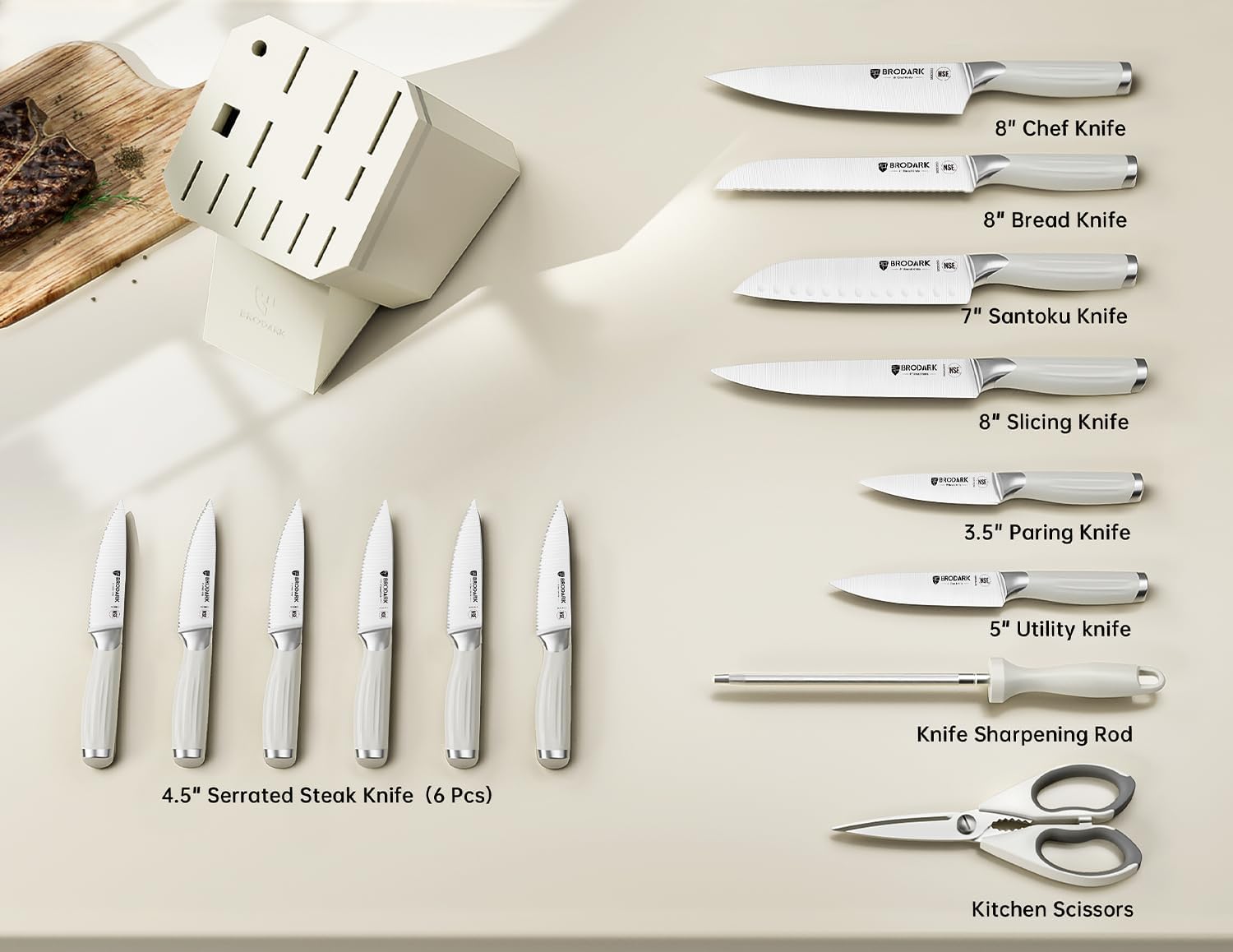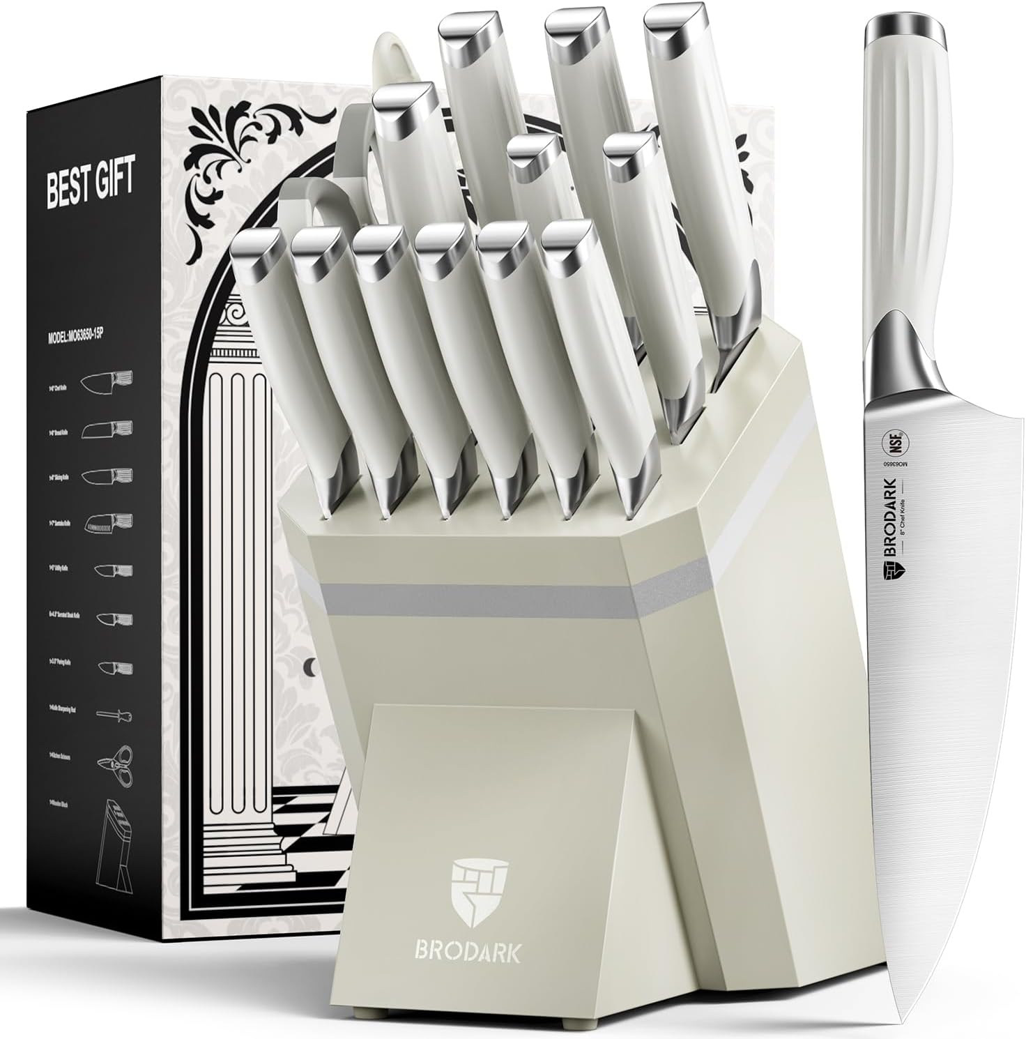 BRODARK Kitchen Knife Set with Block and Sharpening Rod, 15-Piece Full Tang German Stainless Steel Knife Block Set with Ergonomic Roman Handle, White, Ultra Sharp & Rust Resistant, Premium Gift Box
