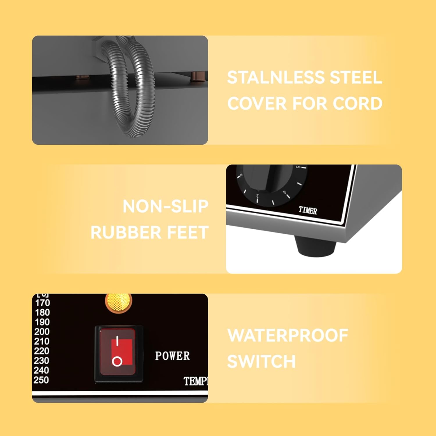 • 【Precise Time and Temperature Control】With a waterproof temperature selector (122°F to 572°F) and timer (0-5 minutes), you can easily adjust settings to make perfect mini Dutch pancakes. This helps solve the common issue of uneven cooking, ensuring consistent results for family gatherings or commercial service.