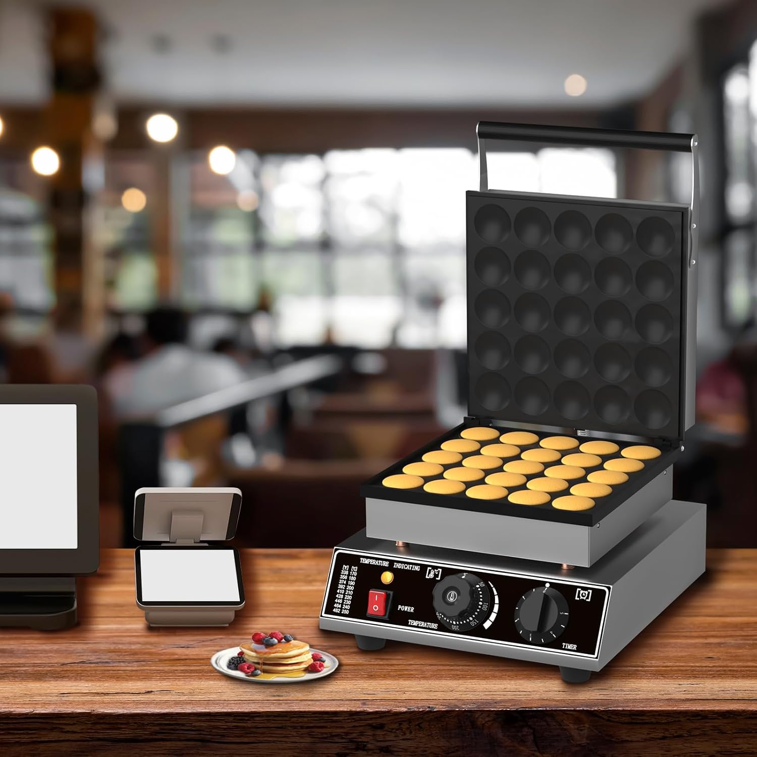 25-Cavity Commercial Mini Dutch Pancake Maker, 1750W Electric Nonstick Stainless Steel Pancake Machine with Timer and Lid for Restaurants, Parties, and Home Use