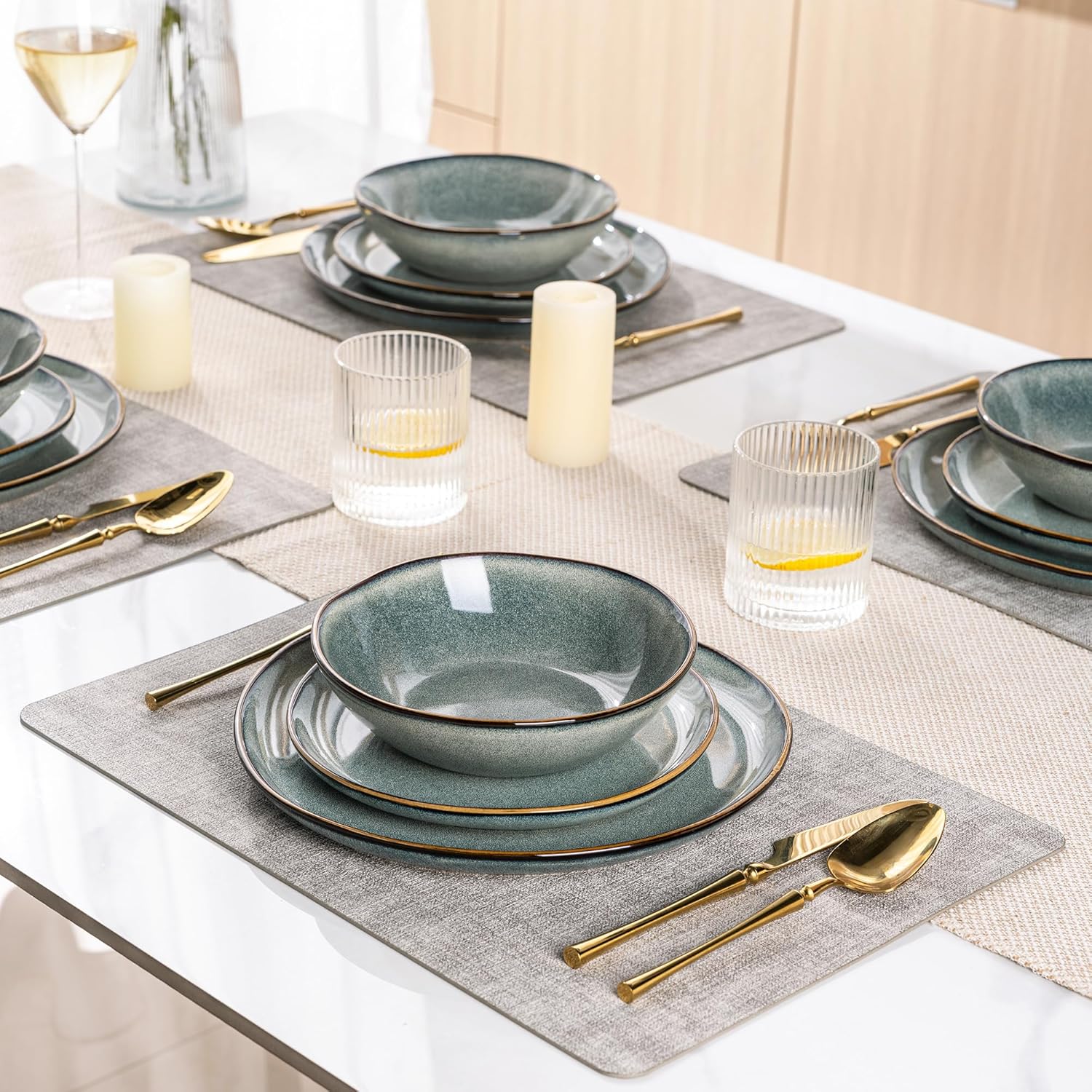 • EVERY PLATE IS UNIQUE: This dinerware set are fired with two different glazes, so the surface develops a beautiful color and makes your food look even more delicious.Since our glaze is all-natural, the surface of plates would change color on different lighting. The color may be a tad different from what you see in the images,but very item is betiful.Our glaze is also extra strong to prevent scratches from your knives and forks