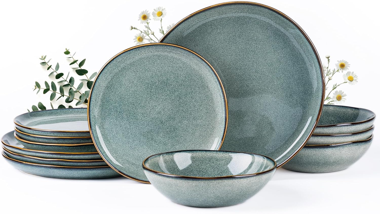 • EVERY PLATE IS UNIQUE: This dinerware set are fired with two different glazes, so the surface develops a beautiful color and makes your food look even more delicious.Since our glaze is all-natural, the surface of plates would change color on different lighting. The color may be a tad different from what you see in the images,but very item is betiful.Our glaze is also extra strong to prevent scratches from your knives and forks