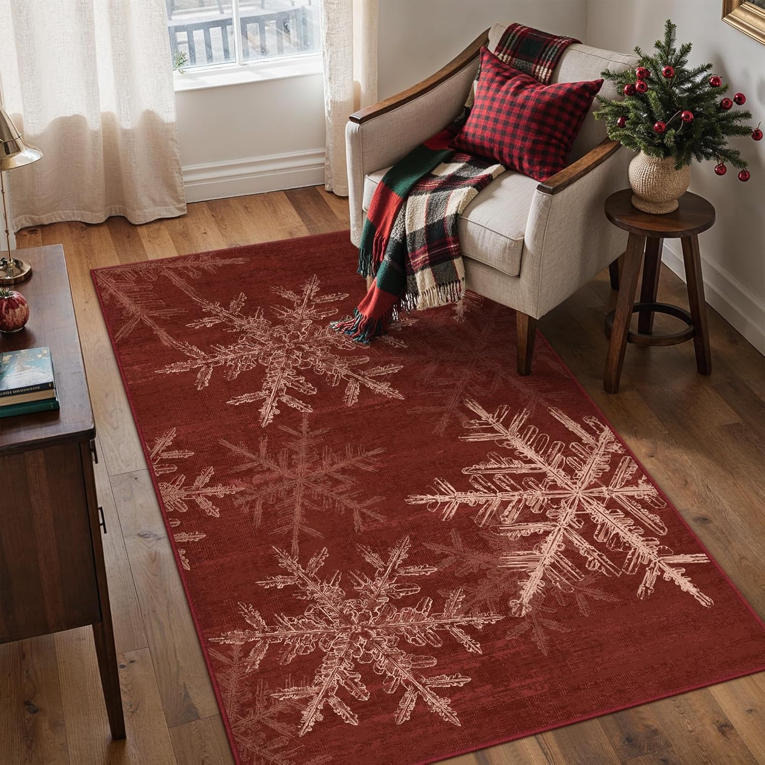 Christmas Area Rug 3x5 Red Washable Office Carpet Xmas Snowflake Holiday Decor Entryway Non Slip Soft Low Pile Small Carpet Indoor Throw Rug Kitchen Living Room Bedroom Entrance Dining Room