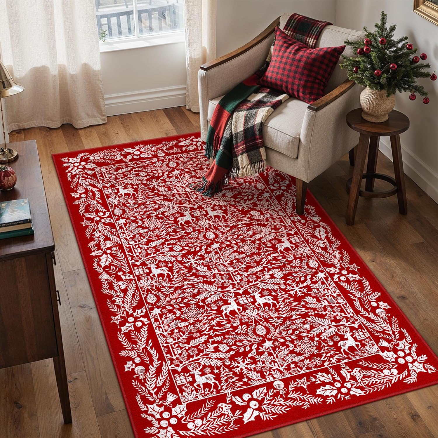 Christmas Area Rug 3x5 Machine Washable Xmas Snowflake Holiday Decor Entrance Rugs Low Pile Carpet Indoor Doormat Red Non-Slip Christmas Deer Carpet for Bedroom Kitchen Entryway Bathroom
