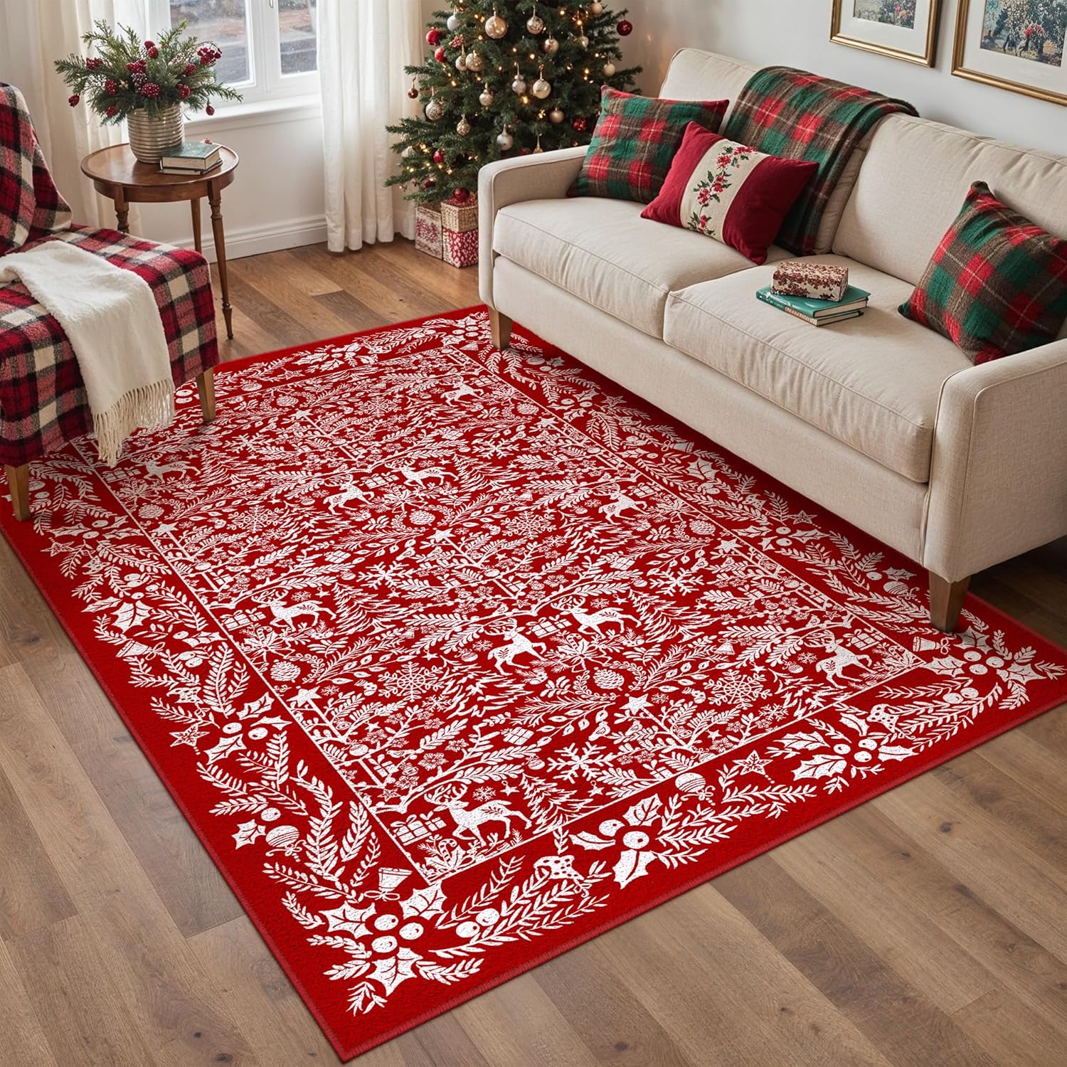 Christmas Area Rug 4x6 Machine Washable Xmas Snowflake Holiday Decor Entrance Rugs Low Pile Carpet Indoor Doormat Red Non-Slip Christmas Deer Carpet for Bedroom Kitchen Entryway Bathroom