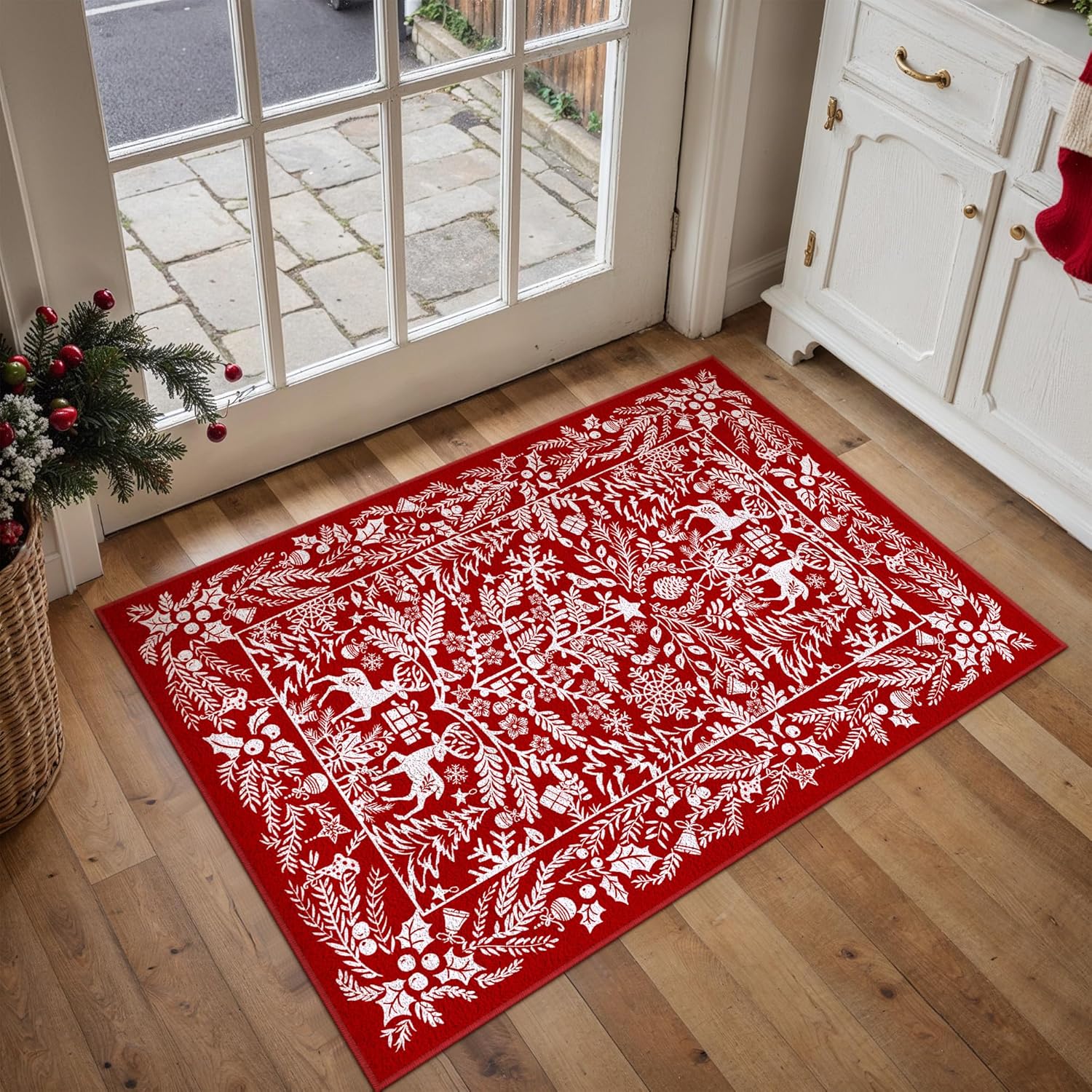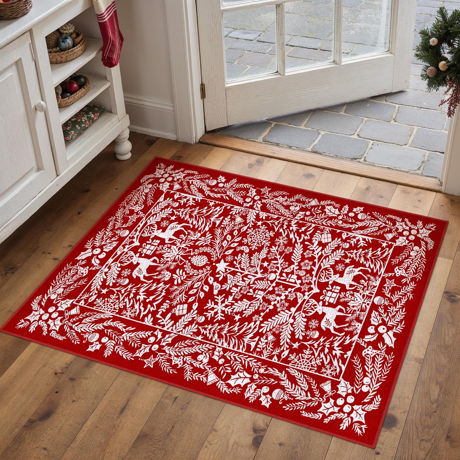 Christmas Area Rug 2x3 Entryway Rug Machine Washable Carpet Red Xmas Deer Indoor Front Snowflake Doormat Non-Slip Soft Low Pile Entryway Carpet for Bedroom Kitchen Entrance Bathroom