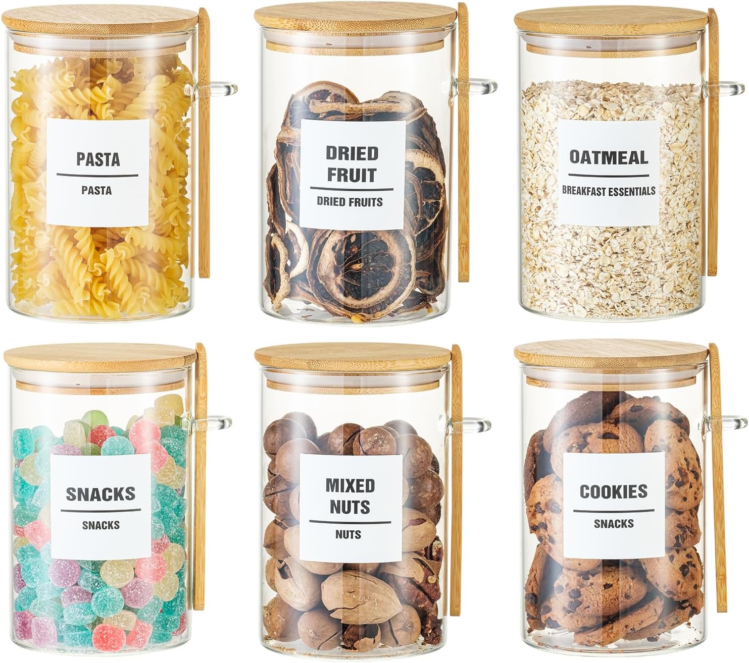 6 Pack 32oz Glass Jars with Bamboo Lids,Glass Storage Containers with Lids,Clear Airtight Food Storage Jar for Coffee,Tea,Sugar,Flour,includes 168 Pantry Labels & Spoons,3mm Thick Canisters