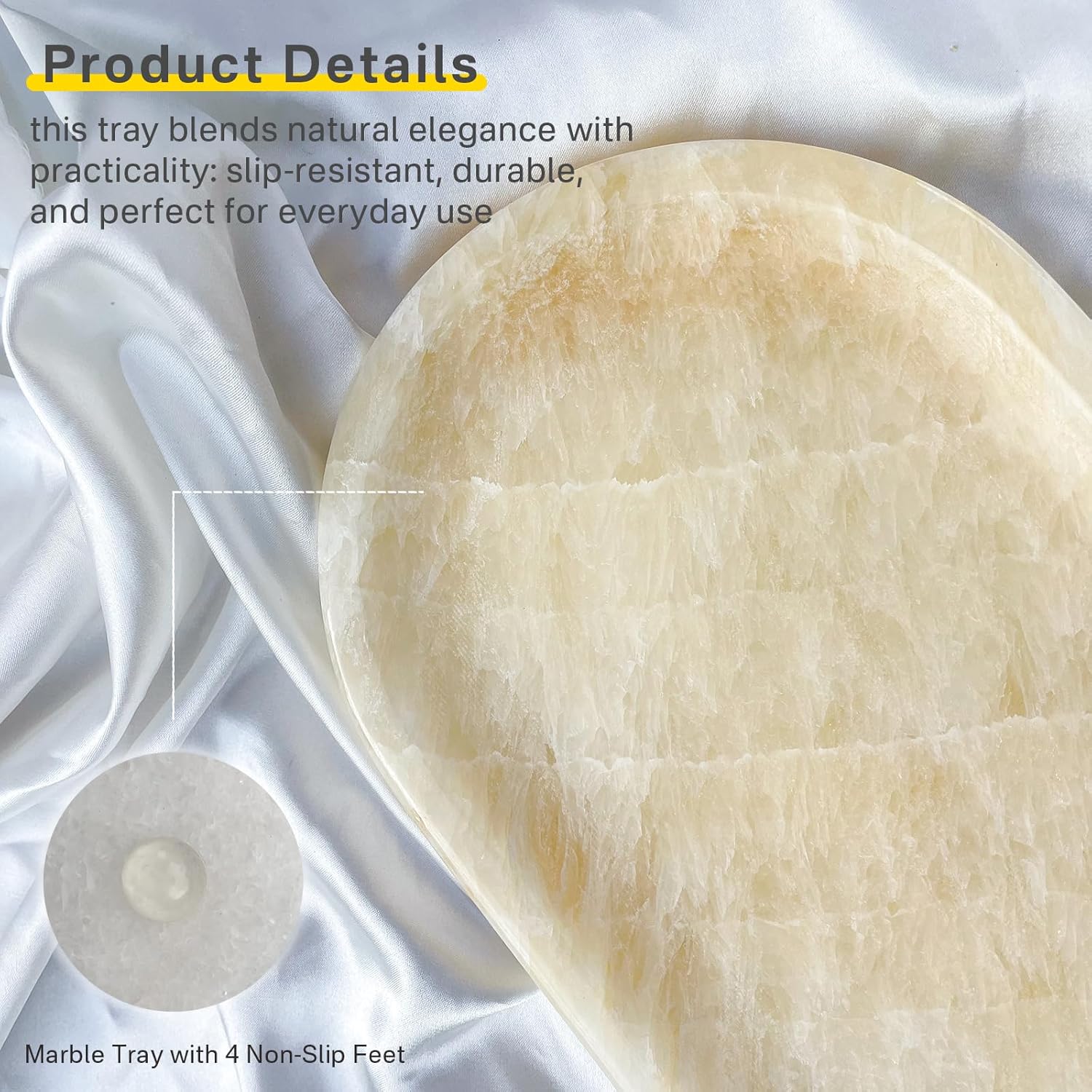 • Sturdy & Easy to Clean The smooth marble surface resists stains and wipes clean in seconds with a damp cloth. Non-slip pads underneath protect furniture and keep this marble bathroom tray securely in place.