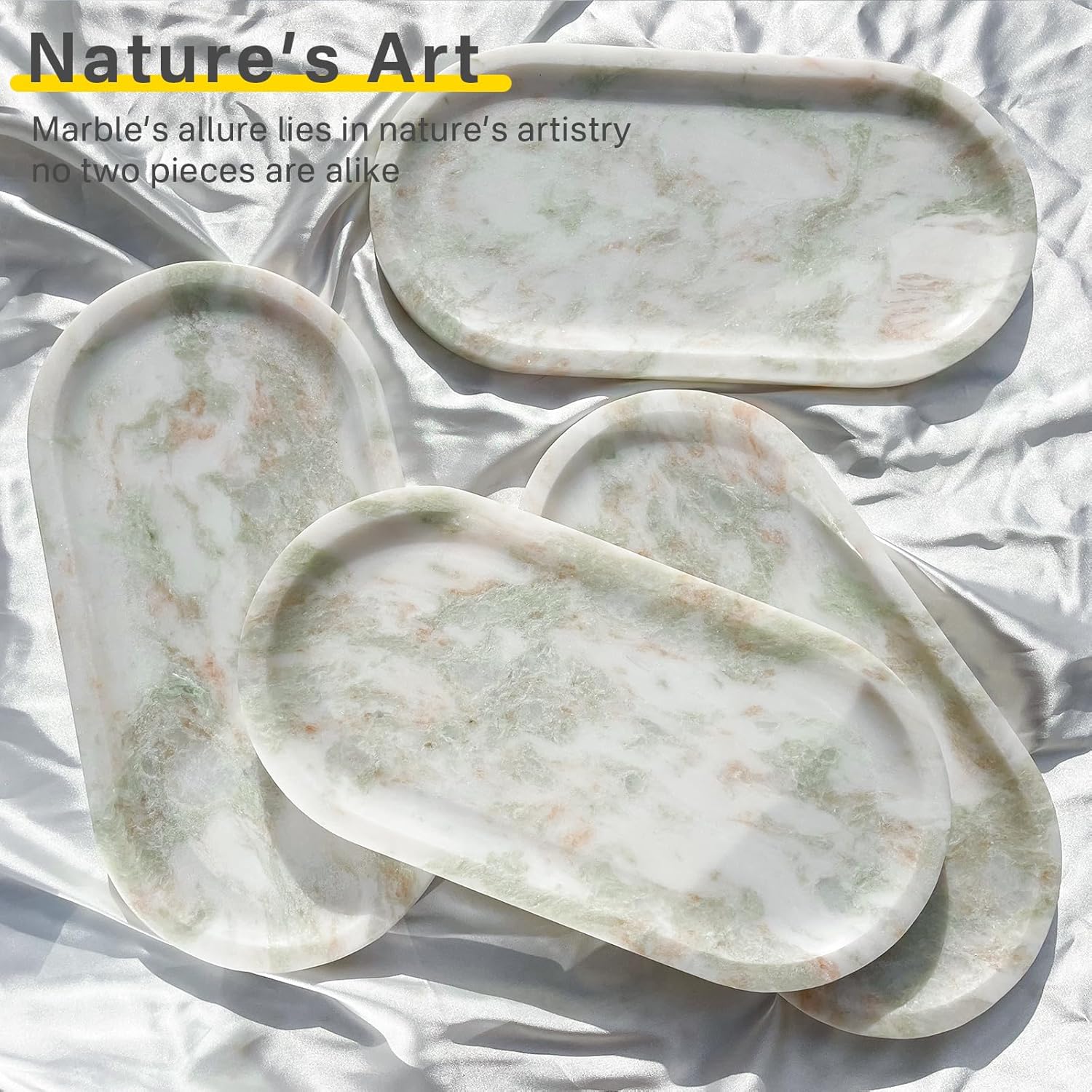Natural Marble Tray, Stone Vanity Tray for Bathroom & Kitchen Countertop - Organizer for Perfume, Jewelry, Cosmetics 12x6 Inch,Pinkish Green