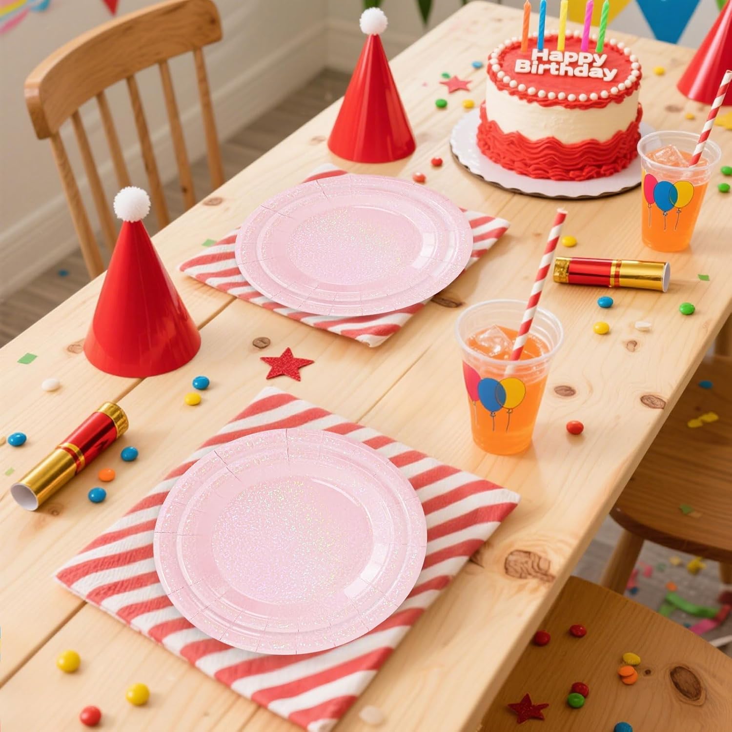 • Shiny paper plates: The pink glitter plates has a shiny holographic design that shows different color effects under lights, enhancing the overall look of the dining table. Using baby pink iridescent party plates will add brighter color to your party