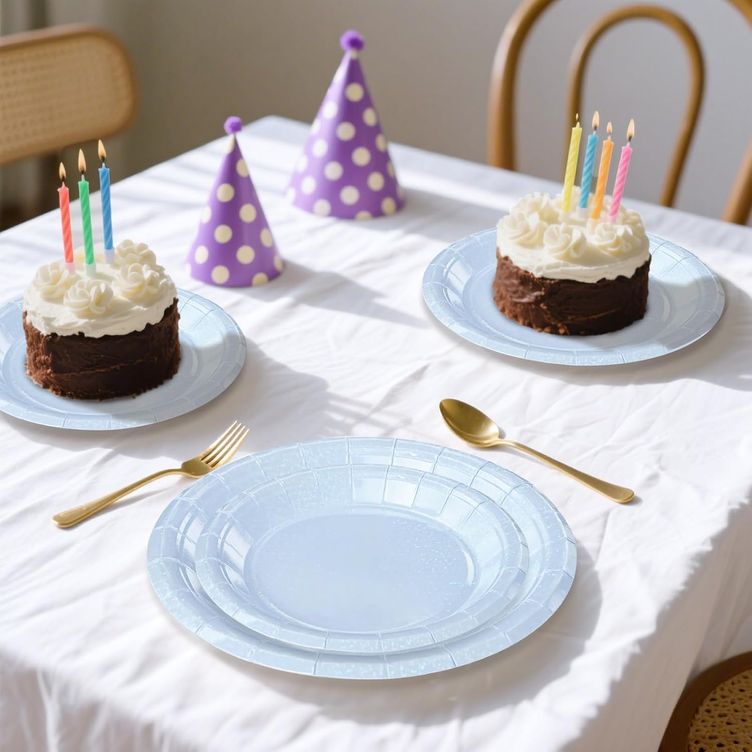 • Disposable plates for party: The blue holographic dinner plates can be used for birthday, baby shower, disco party, wedding, shining theme party, or daily use. The light blue glitter dessert plates can provide convenience for both you and guests for parties