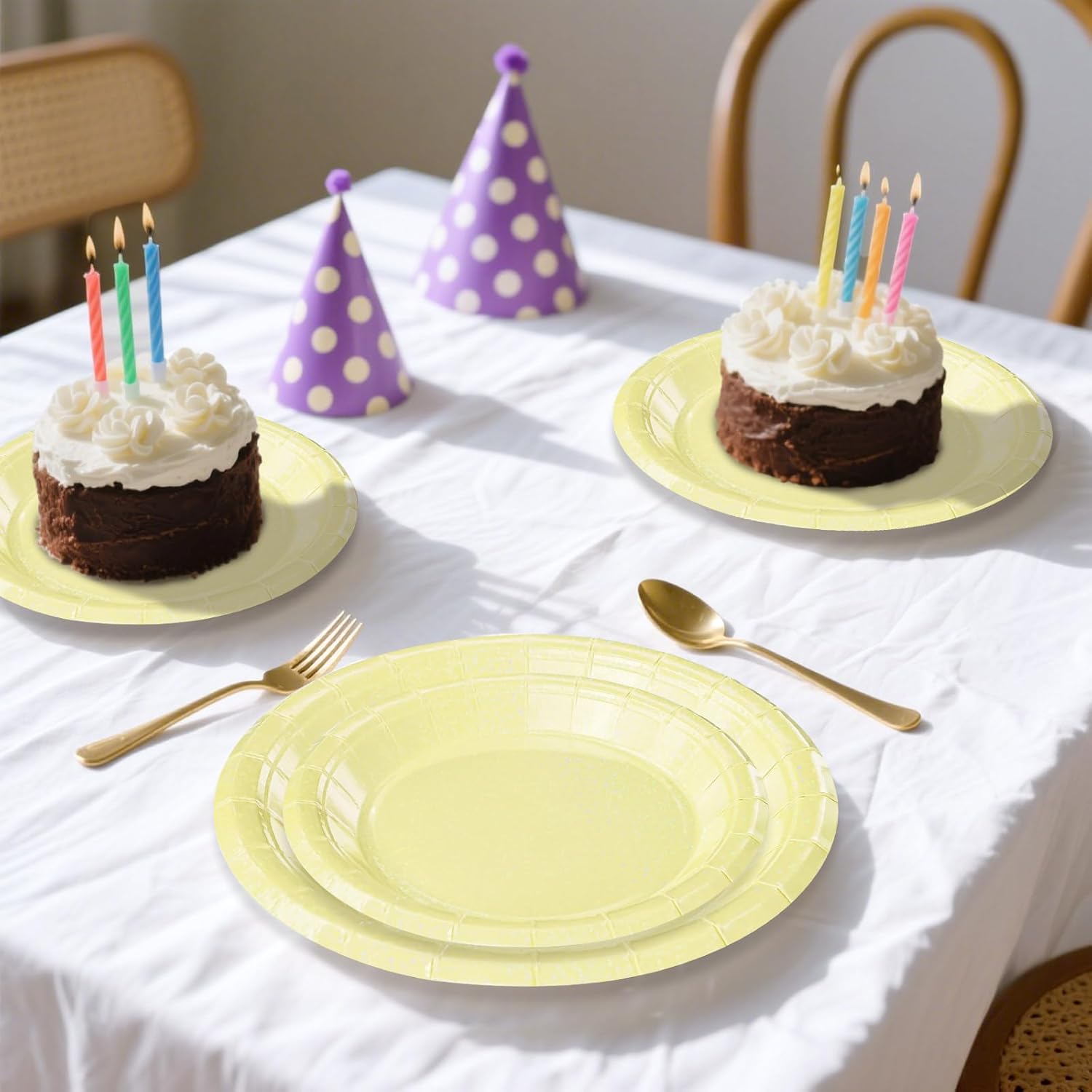 • Disposable plates for party: The yellow holographic dinner plates can be used for birthday, baby shower, disco party, wedding, shining theme party, or daily use. The yellow glitter dessert plates can provide convenience for both you and guests for parties