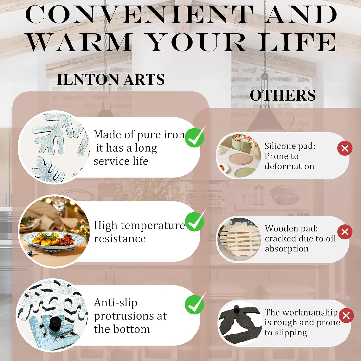 • ❄【FREE HEAT RESISTENT SILICON GLOVES & RUBBER PEG】The Cast Iron Trivet comes with complimentary heat resistant silicone GLOVES for safe handling. The integrated rubber pegs provide enhanced anti-slip protection, effectively safeguarding your tabletops and countertops from both heat damage and surface scratches.