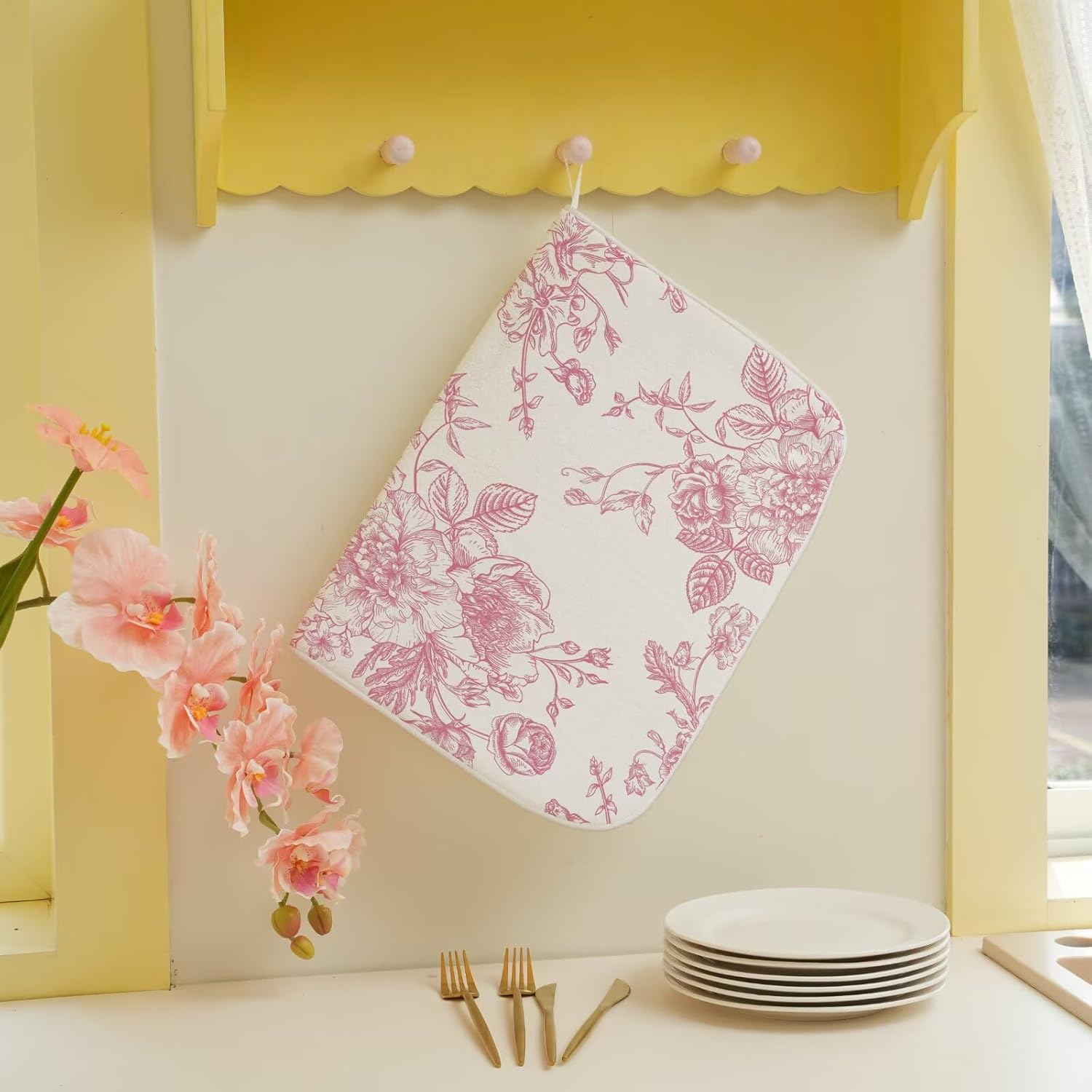 • Large Size: The pink chinoiserie floral dish drying mat measures 18 x 24 inches making it ideal to use it under small kitchen gadgets such as sink rack, blenders, utensils strainer, etc