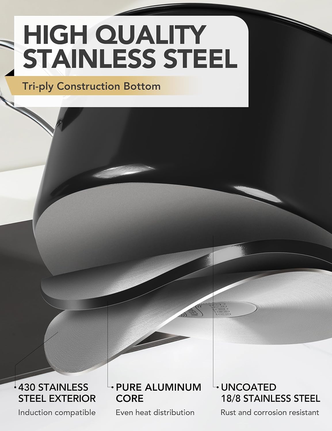 • Even Heat Distribution - Tri-ply base ensures quick, uniform heating in these stainless steel pots, eliminating hot spots for perfect results every time. Safe and efficient.