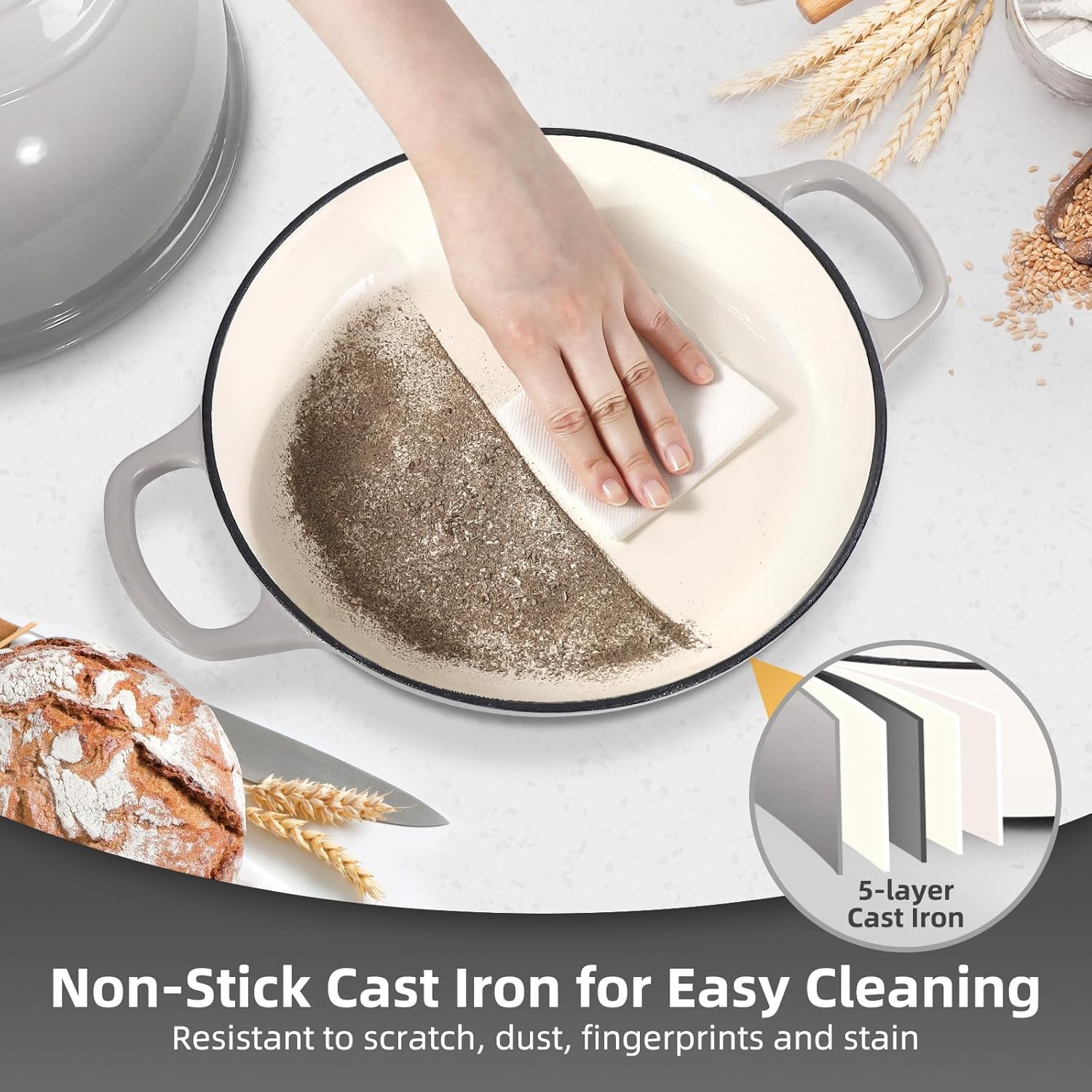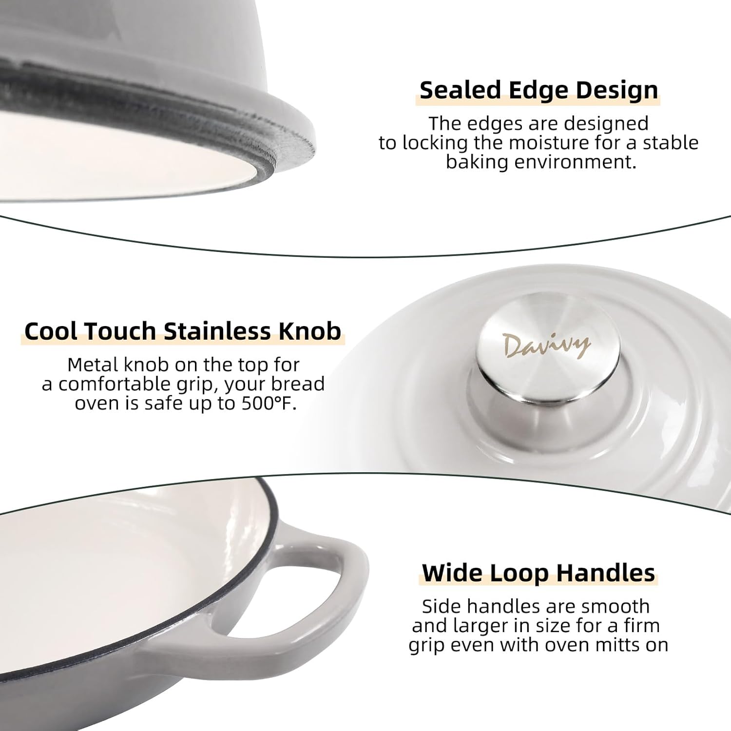 Davivy 5.5QT Cast Iron Dutch Oven with Lid, Bread Dutch Oven for Sourdough Bread, 10" Round Sourdough Bread Baking Pan, Enameled Cast Iron Bread Oven - Light Grey