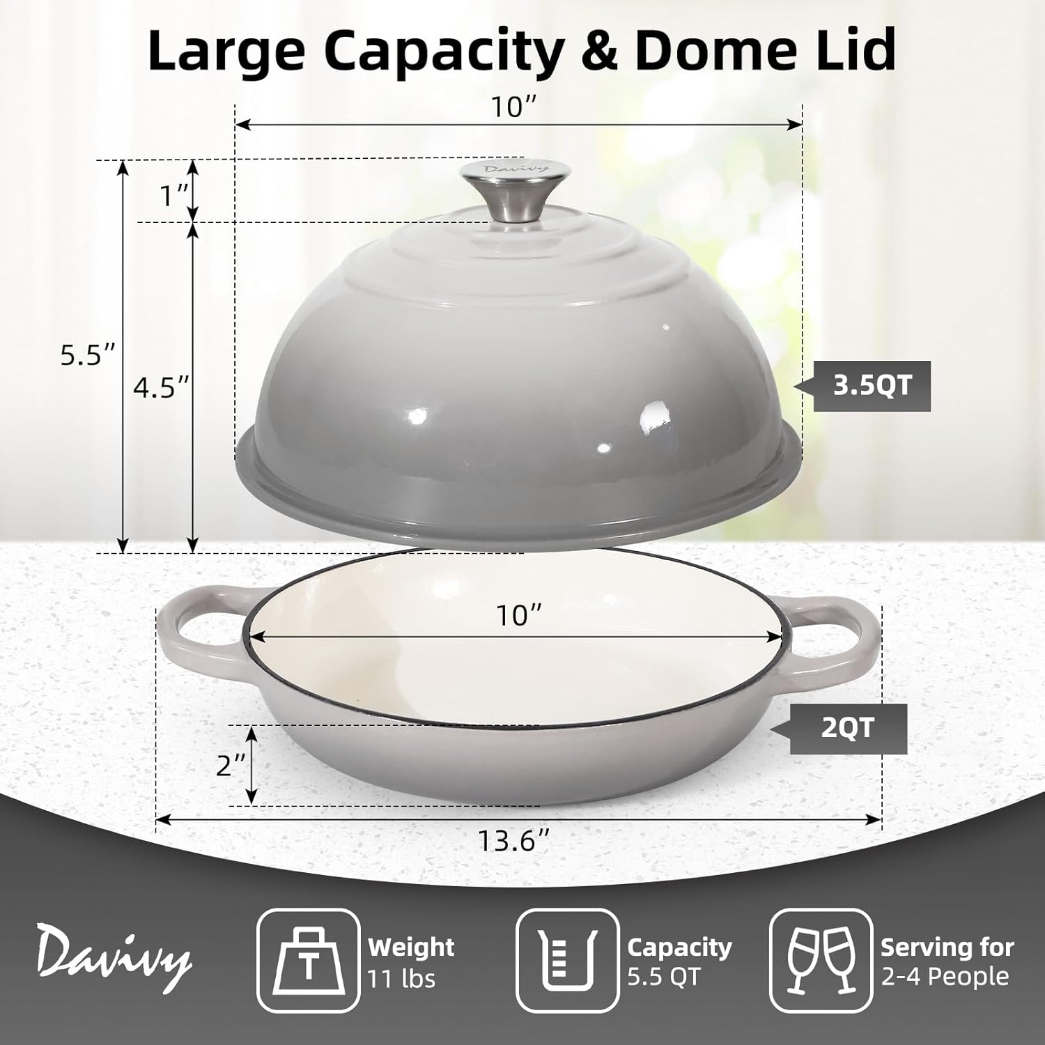 • ★【Unique Domed Lid & Designed for Baking】Davivy 5.5 Quart Cast Iron Dutch Oven has a unique 4.5-inch tall airtight domed lid for the golden crust sourdough bread and a rich fermented flavor. Our Sourdough Bread Oven provides a better and consistent baking environment for excellent fermentation by maintaining heat and internal steam circulation. Better for sourdough starters, experts and home users.