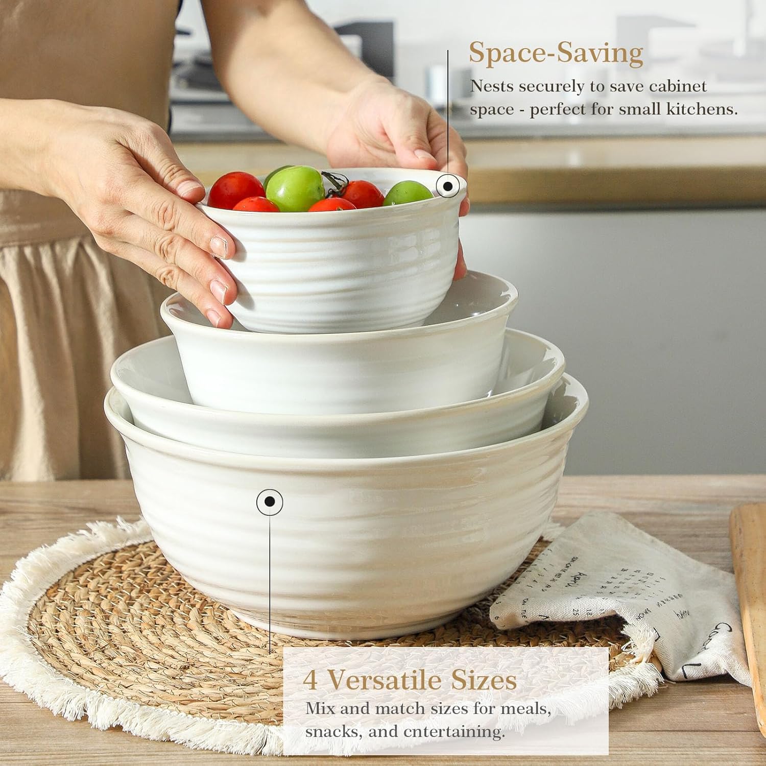 Hasense Porcelain Mixing Bowls, 2.8/2.1/1.0/0.5 Qt, Handmade Large Salad Serving Bowls for Kitchen, Deep Nesting Dishes for Cooking and Baking, Microwave Dishwasher Safe, Clay-Infused White