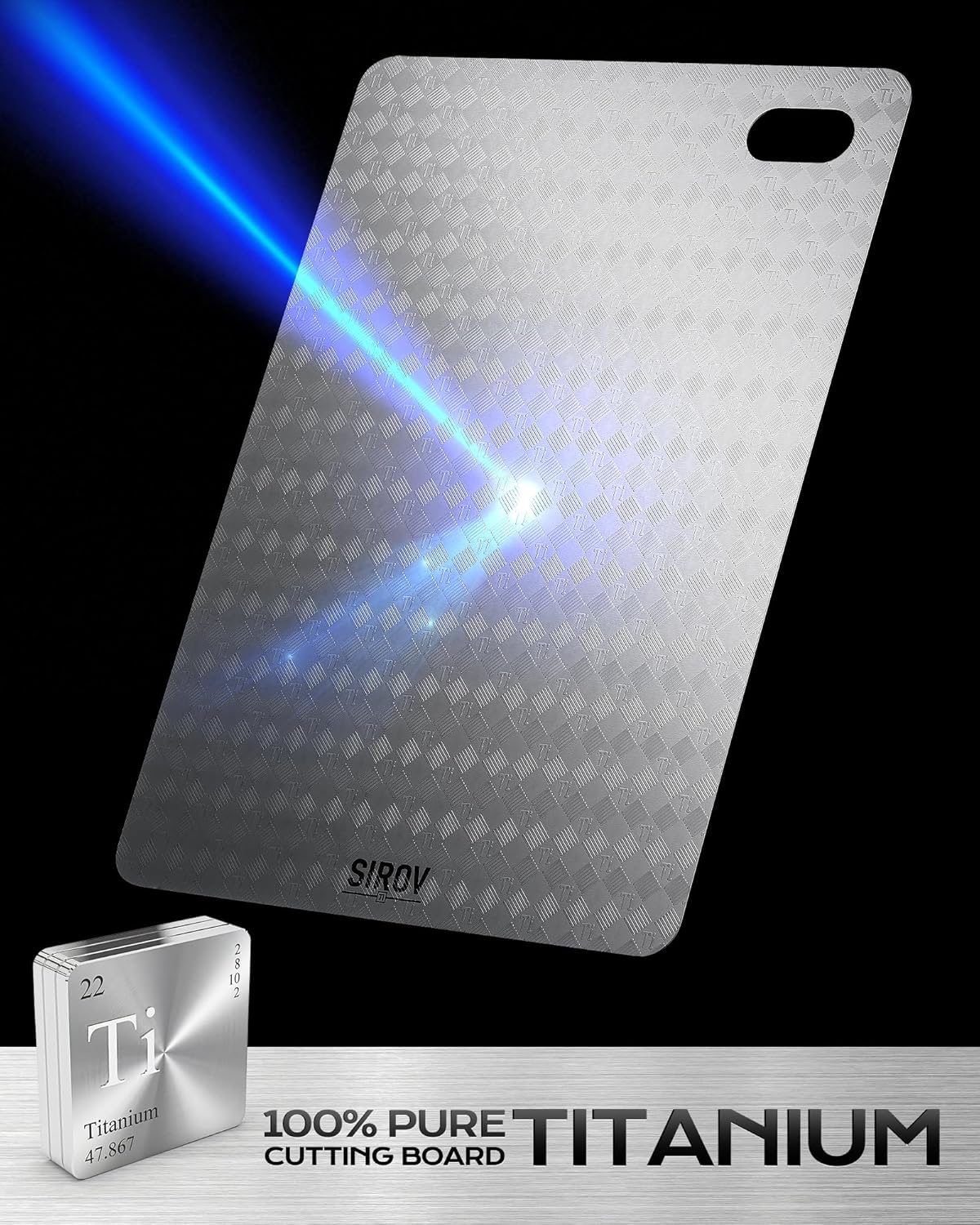 • [Elegant in Design]: A masterpiece of both functionality and aesthetics. Crafted from 100% pure titanium, it boasts a natural metallic luster that adds a touch of sophistication to any kitchen setting. Plus the unique chessboard pattern design which not only enhances its visual appeal but also provides a non-slip surface for more efficient food preparation. Our titanium cutting board is more than just a kitchen tool; it's an exquisite work of art that combines elegance with practicality.