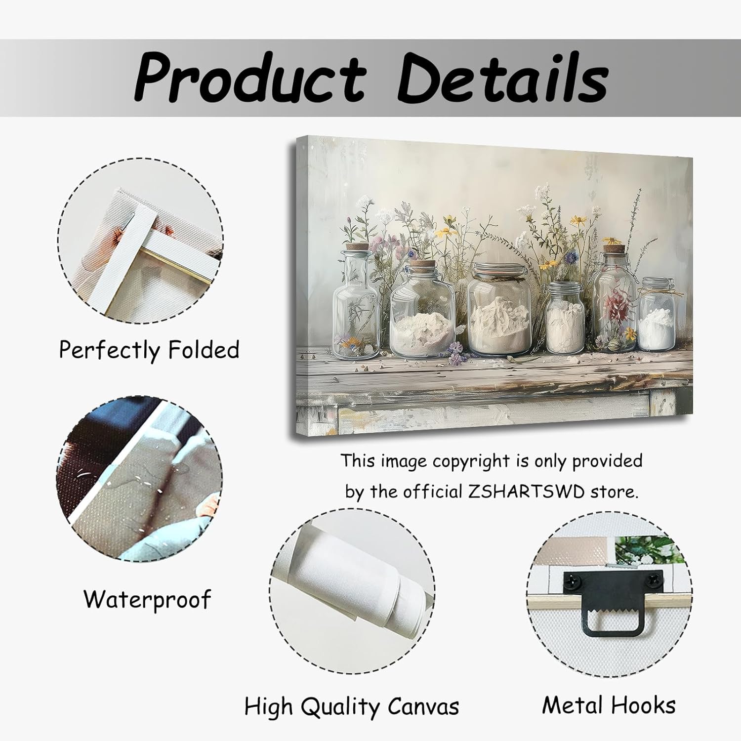 ZSHARTSWD Farm Kitchen Wall Art Country Mason Jar Spice Pictures Still Life Culinary Canvas Print Vintage Spices Food Painting Dining Room Home Decor Framed (White, 24.00" x 36.00")