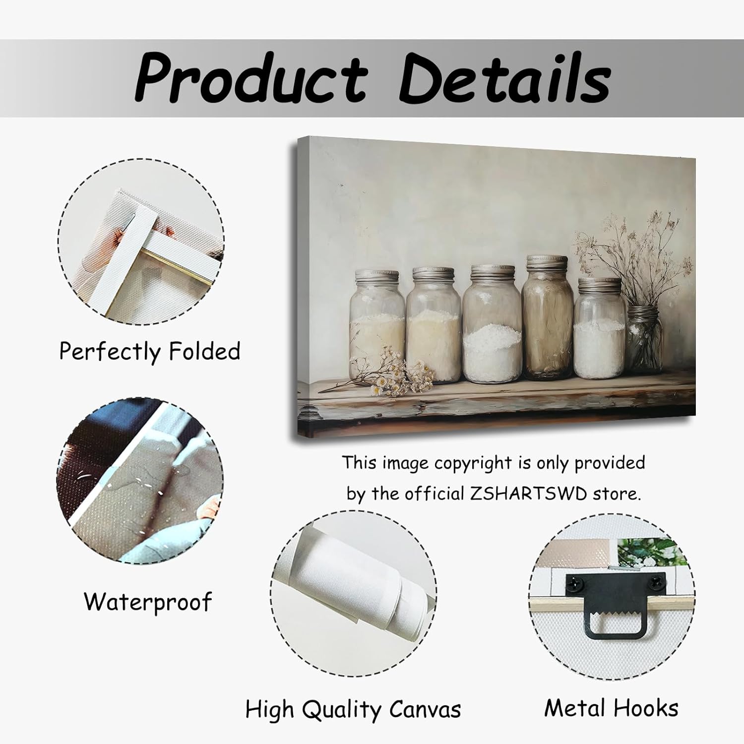 ZSHARTSWD Farm Kitchen Wall Art Country Mason Jar Spice Pictures Still Life Culinary Canvas Print Vintage Spices Food Painting Dining Room Home Decor Framed (Beige, 16.00" x 20.00")