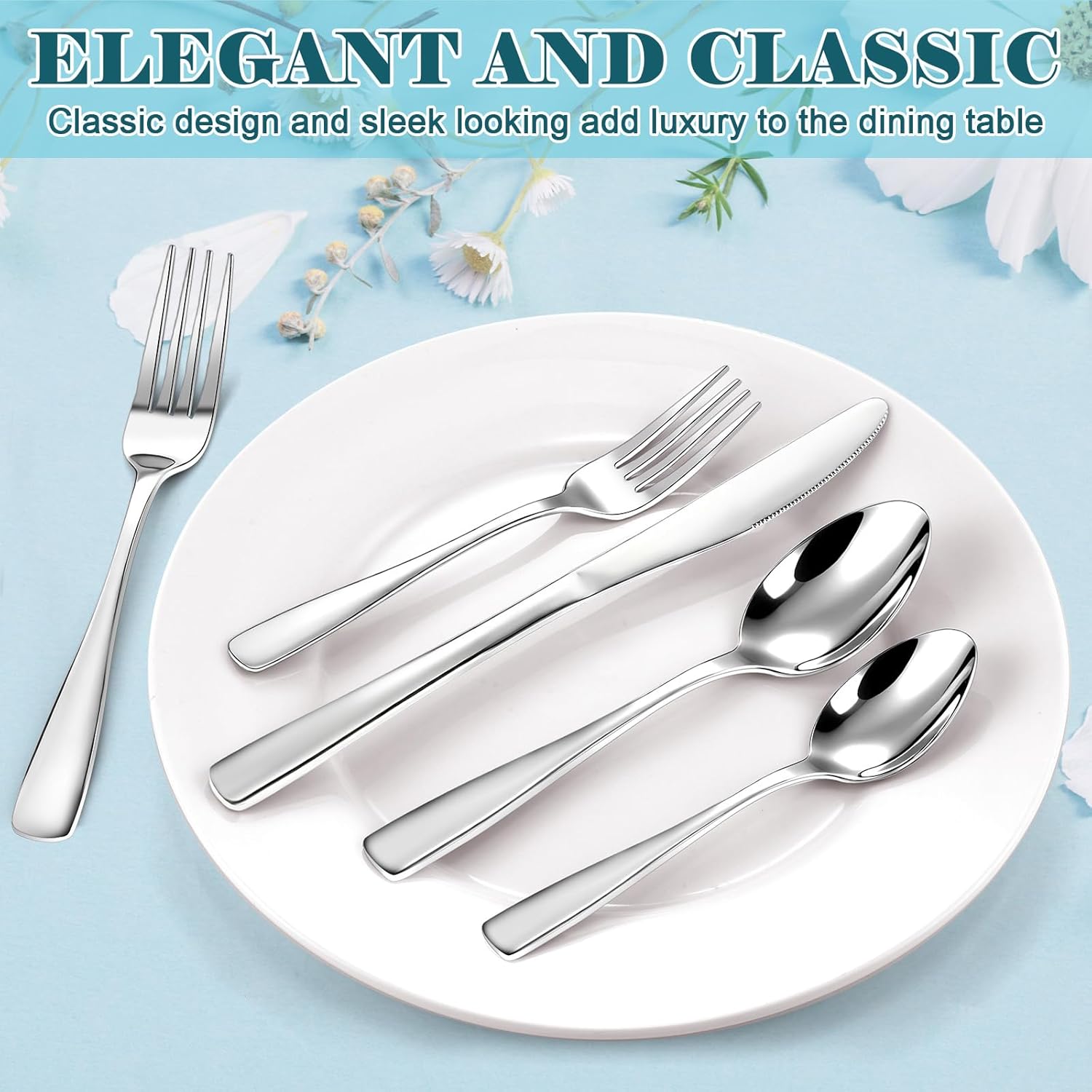 • 【Elegant Mirror-Polished Finish】Multiple layers of meticulous polishing give this silverware a long-lasting mirror shine. This silverware set keeps its luster after repeated dishwasher use (no re-polishing needed), saving you time and hassle. Plus, it has smooth, rounded edges for safety across all ages. Its timeless, elegant design effortlessly complements any table setting, making it an ideal choice for formal occasions like housewarming celebrations, or as a thoughtful Mother's Day gift