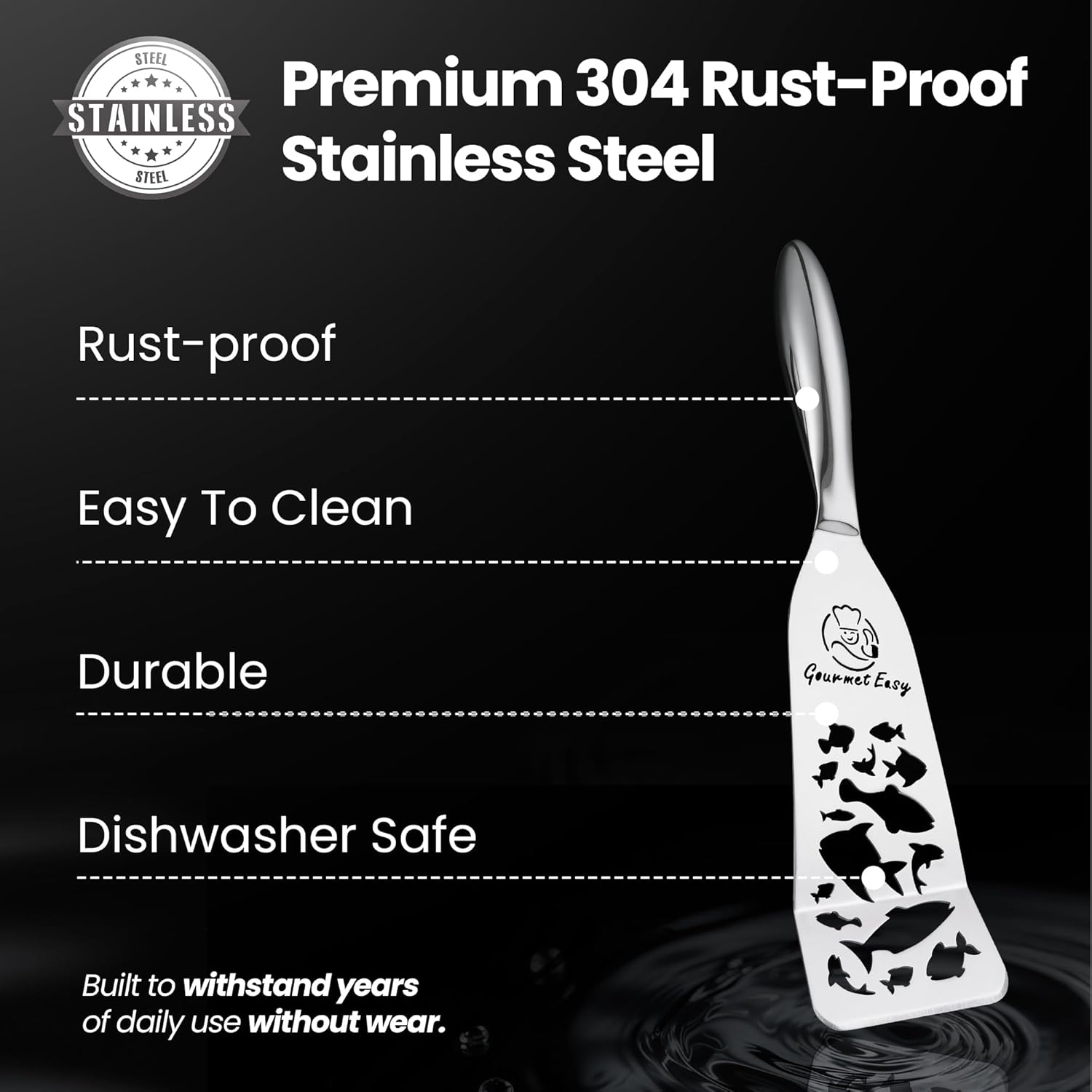 • ONE-PIECE STAINLESS STEEL CONSTRUCTION – Made from a single piece of 304 stainless steel, this fish spatula stainless steel resists rust and bending. The seamless design prevents food or grease from sticking—ideal for any metal kitchen utensils set.