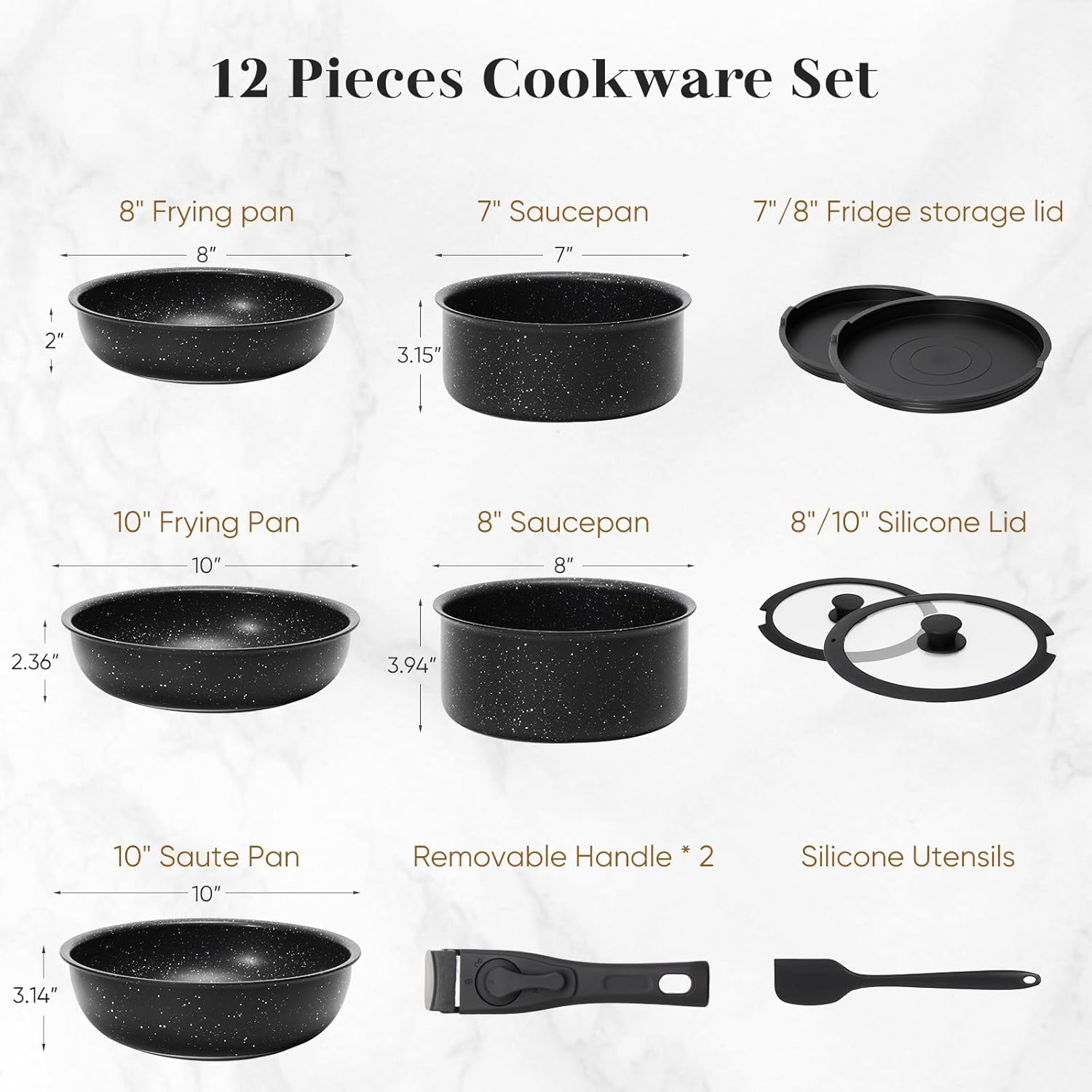 Sweetcrispy 12 pcs Pots and Pans Set, Nonstick Kitchen Induction Cookware Suit with Detachable Handle, Dishwasher Oven Safe, Pitch Black