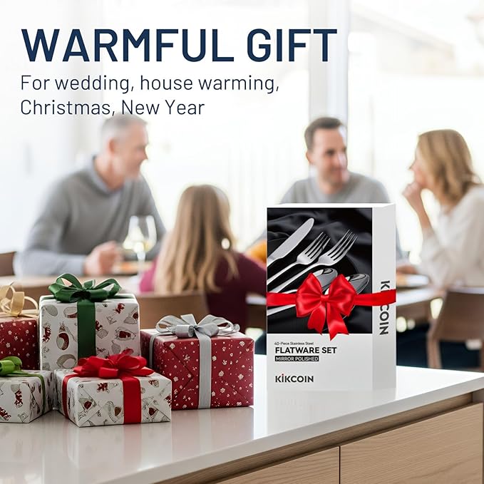 • 【40 PACK FOR 8】This 40-piece stainless steel silverware set—service for 8, including Dinner Knives, Forks, Salad Forks, Spoons, and Teaspoons—comes beautifully packed in a gift box.