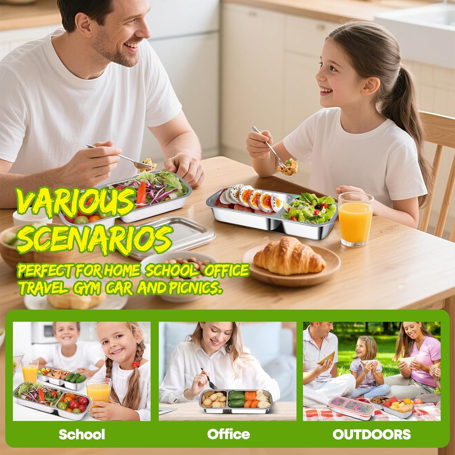 • 【Versatile 3-Compartment Design for Snacks, Fruits & Sauces】The divided stainless steel bento box features 3 leak-proof compartments to separate snacks, fruits, dips, or sauces without mixing flavors. Ideal for meal prep, picnics, or school lunches, it’s a reusable snack container with lids that prevents spills.