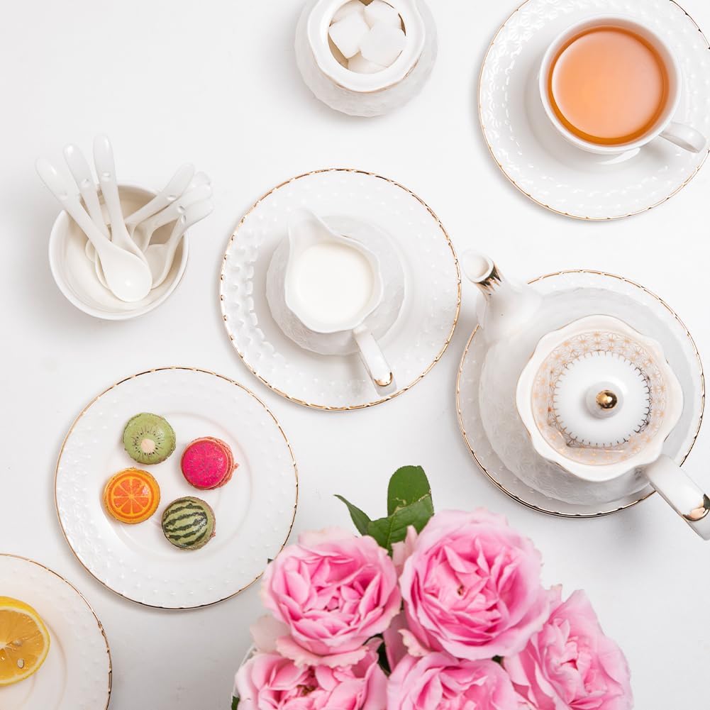 • 【Thoughtful Details Enhance the Experience】: Designed for functionality: the teapot has an ergonomic, heat-resistant handle; the sugar bowl and creamer come with spoons; and saucers securely hold cups to prevent spills. Every detail is meticulously crafted for a pure tea-drinking pleasure.