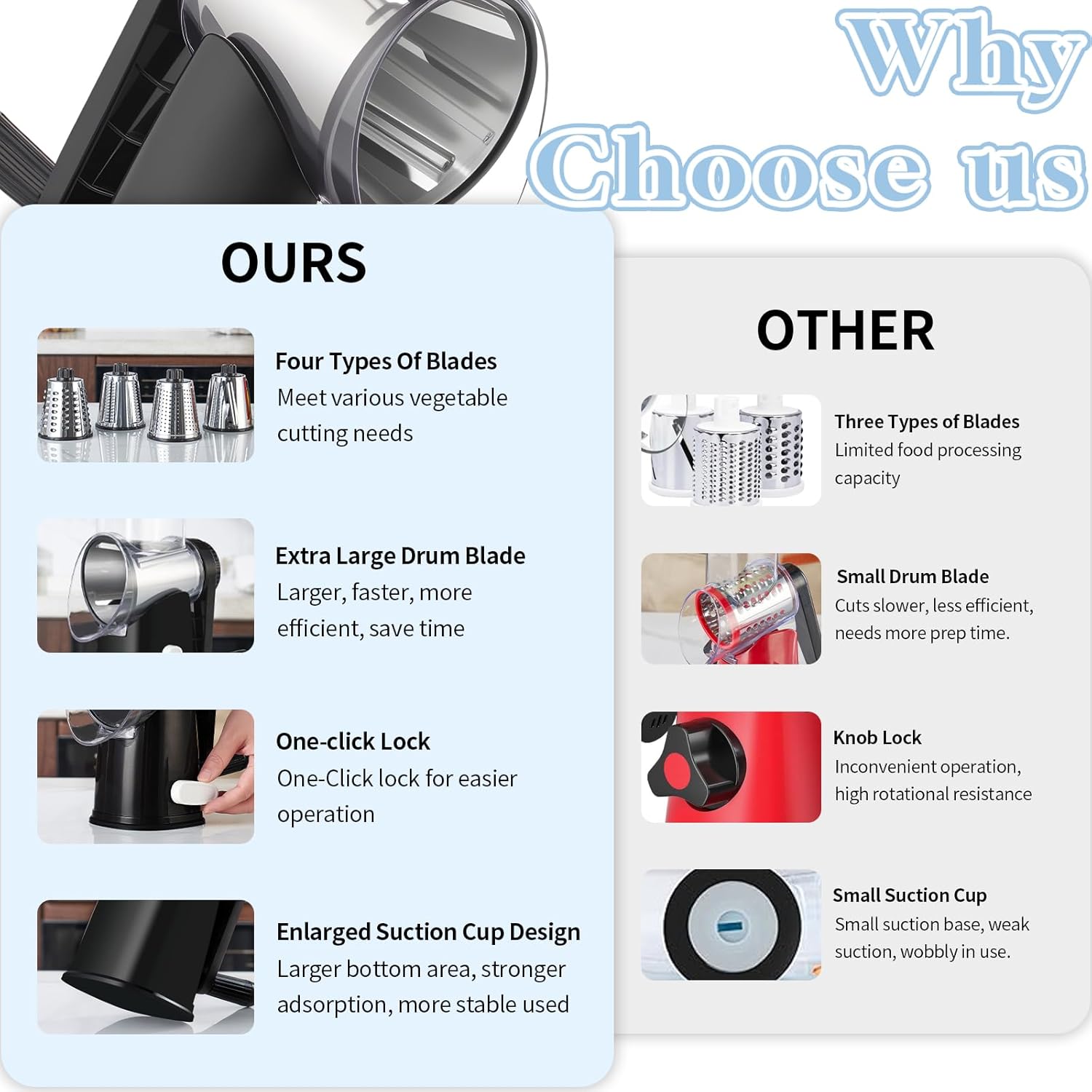 • Upgraded 4-in-1 Drums – Larger, Faster, More Efficient : Rotary cheese grater features 4 premium 430 stainless steel drums: slice, wavy slice, fine shred, and grind. Our extra-large cutting barrels process more food per turn—faster and more efficient than other grater. Ideal for prepping cheese, potatoes, zucchini, cucumbers, carrots, and more with ease.
